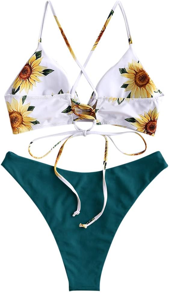 ZAFUL المرأة عباد الشمس متقاطع مجموعة البكيني الدانتيل يصل ملابس السباحة زهرة طباعة عالية قطع ثوب السباحة الأخضر الأزرق S