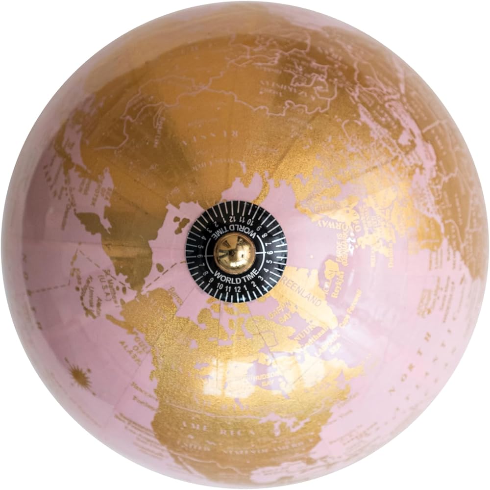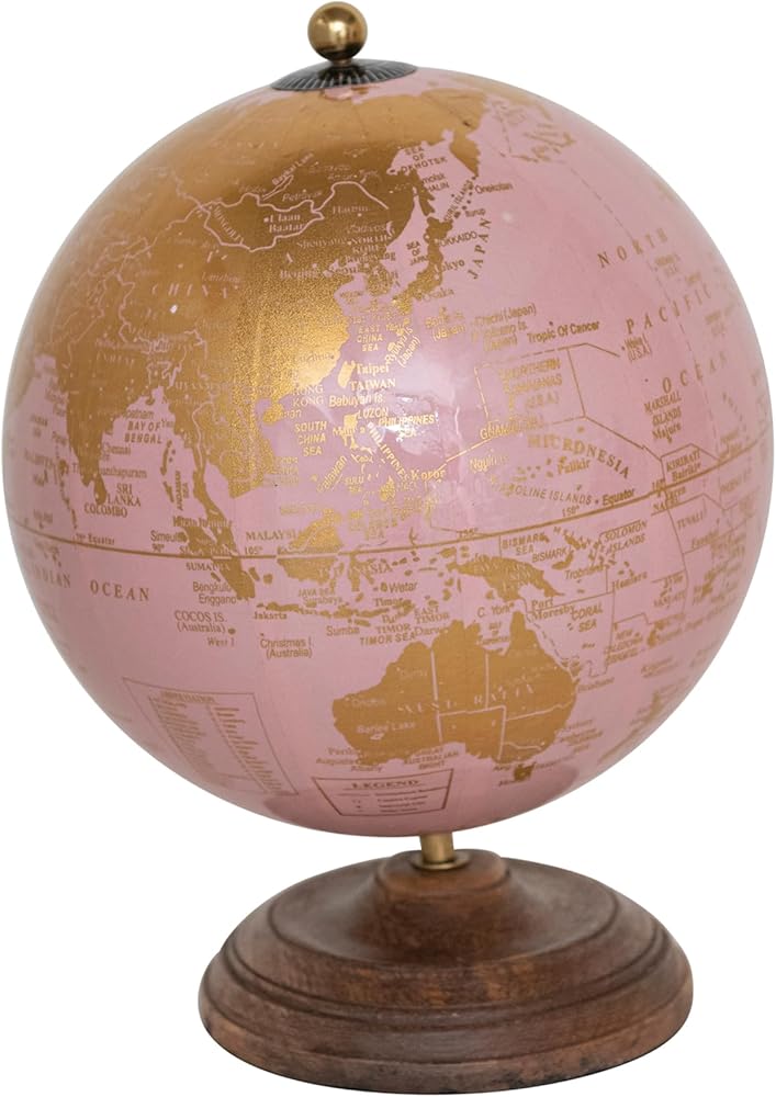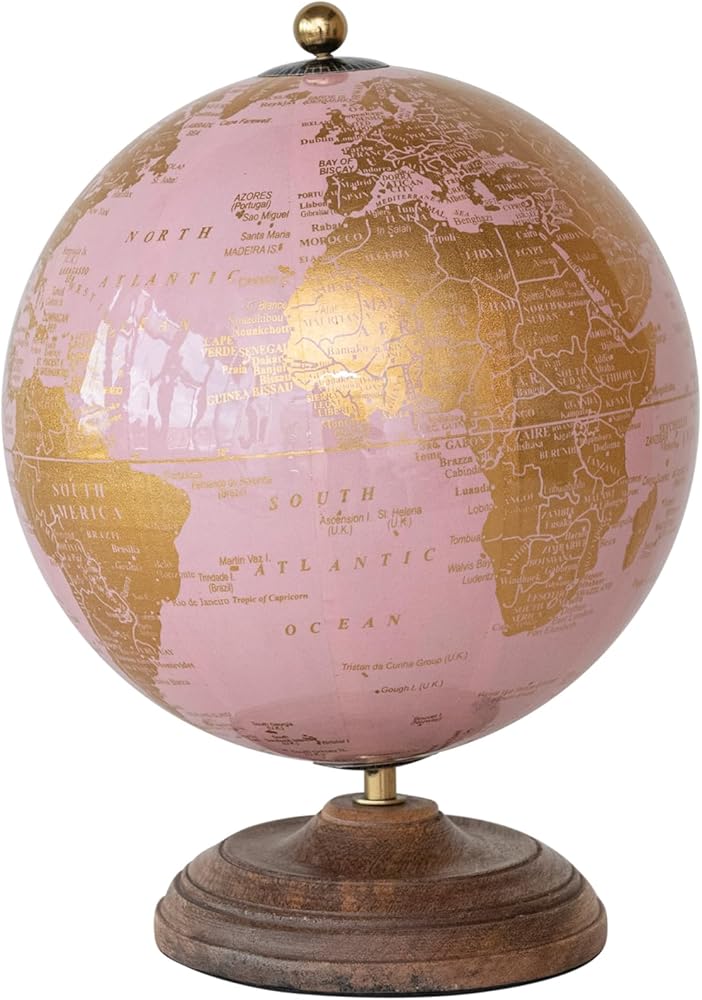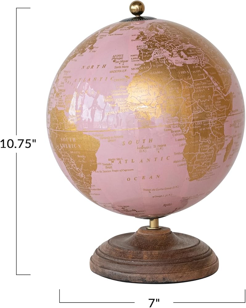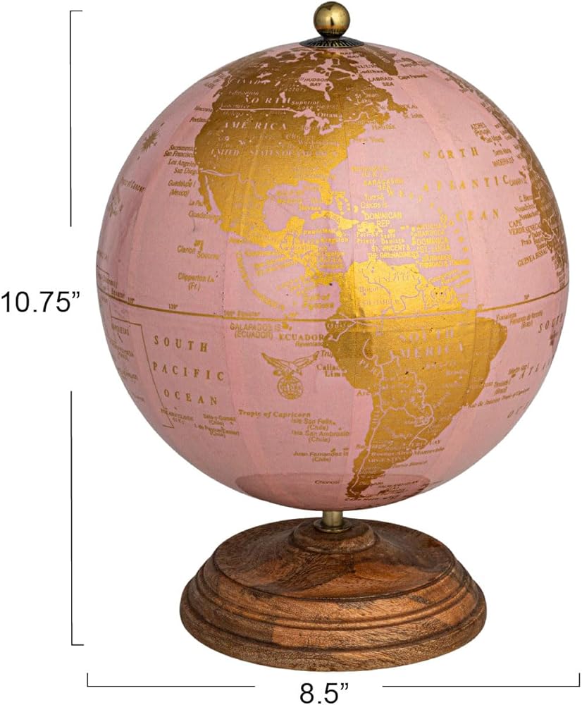 Bring color and adventure to the home with this metal and plastic globe on a mango wood stand. This globe is a beautiful and functional piece that can be used as a decoration or a learning tool. The globe features a pink and gold color scheme that gives it a modern and chic look. The globe has a detailed map of the continents and countries and a metal meridian that allows the rotation of the globe and the discovery of new places. The globe is made of metal and plastic materials that are durable and lightweight and can withstand scratches and dents. The globe rests on a natural mango wood stand that is eco-friendly and sturdy. The globe measures 8.5 inches in diameter and 10.75 inches in height, making it a medium-sized and attractive decoration for the space. The globe can be placed on a desk, a bookshelf, or a side table, creating a cozy and inviting atmosphere. This globe is a stylish and educational piece for farmhouse, boho, cabin, cottagecore, or global-style decor. It is a perfect way to add color and adventure to the home.