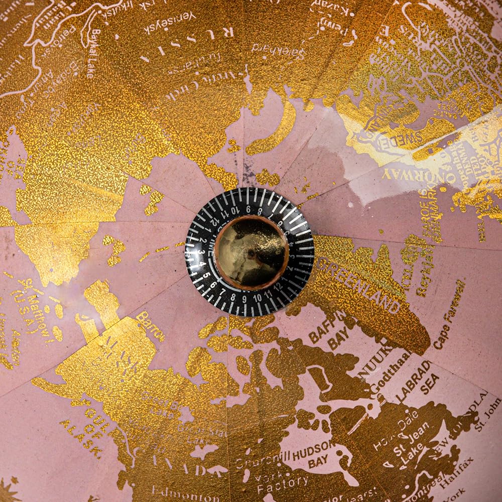 • Explore the world with this metal and plastic globe that features a pink and gold color scheme and a natural mango wood stand