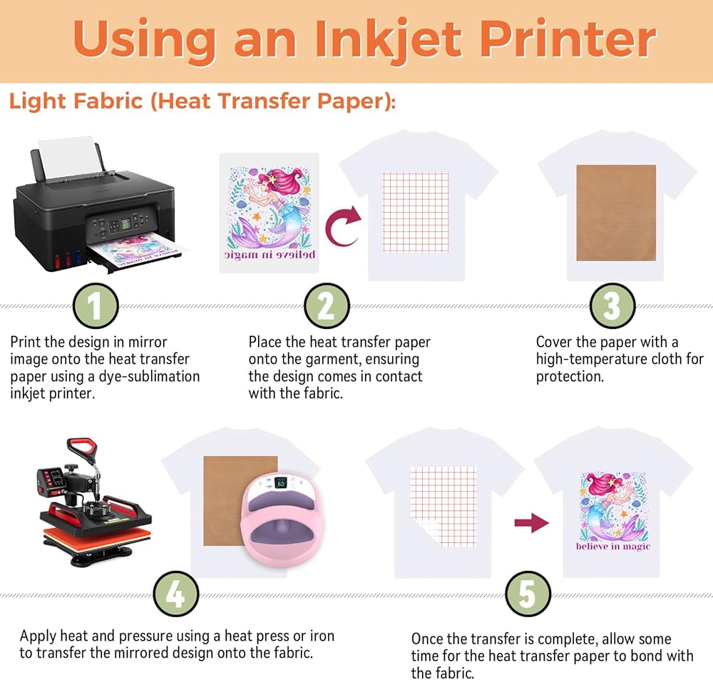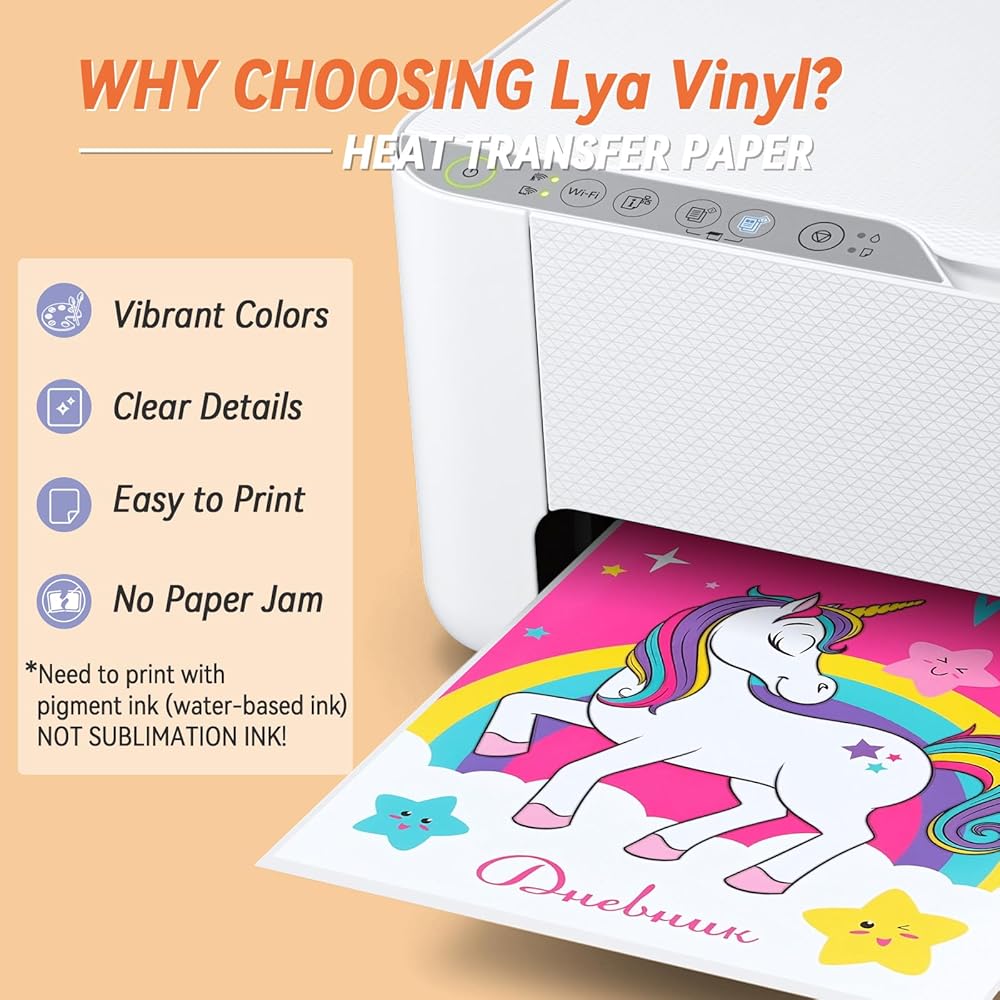「Pigment & Dye Ink」-تعمل ورقة نقل الحديد على القمصان مع جميع طابعات الحبر. للحصول على أعلى مستويات الجودة ، نوصي باستخدام حبر الصباغ مع فينيل نقل الحرارة القابل للطباعة. ملاحظة: ورقة النقل الخاصة بنا غير متوافقة مع حبر التسامي.