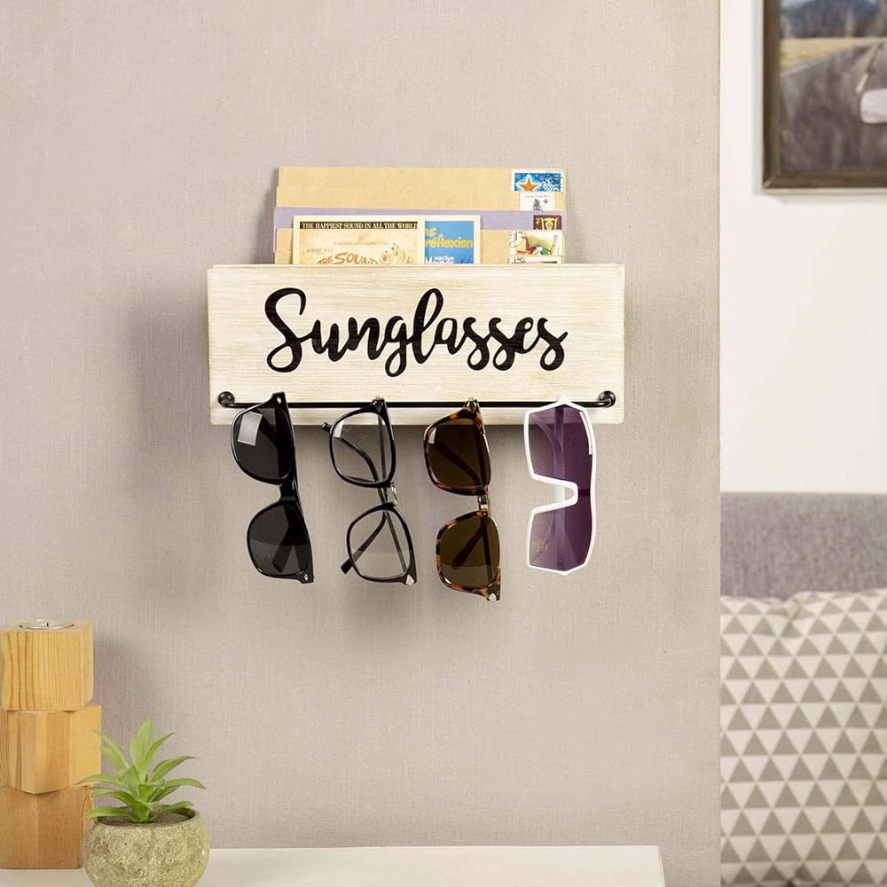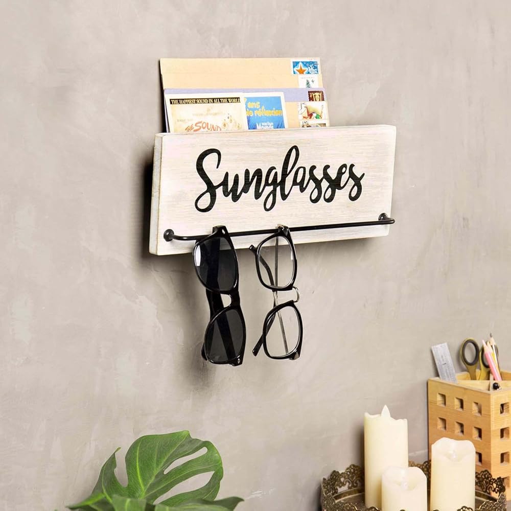 رف تخزين مدخل خشبي محمولة على الحائط للنظارات الشمسية والبريد مع السكك الحديدية المعدنية السوداء التي توفر عرضًا حديثًا للنظارات