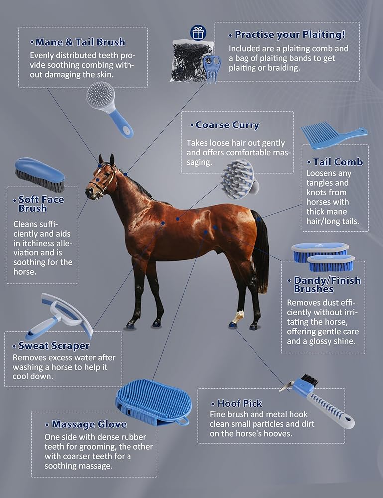 هدية مثالية لصديق محب للخيول: هذه المجموعة من الفرش رائعة لمحبي الخيول والركاب المبتدئين الذين يهتمون بصديقهم ذو الأربعة أرجل. يساعد الحفاظ على النظافة المناسبة للحصان في بناء رابطة لطيفة وقوية مع الحصان في هذه العملية.