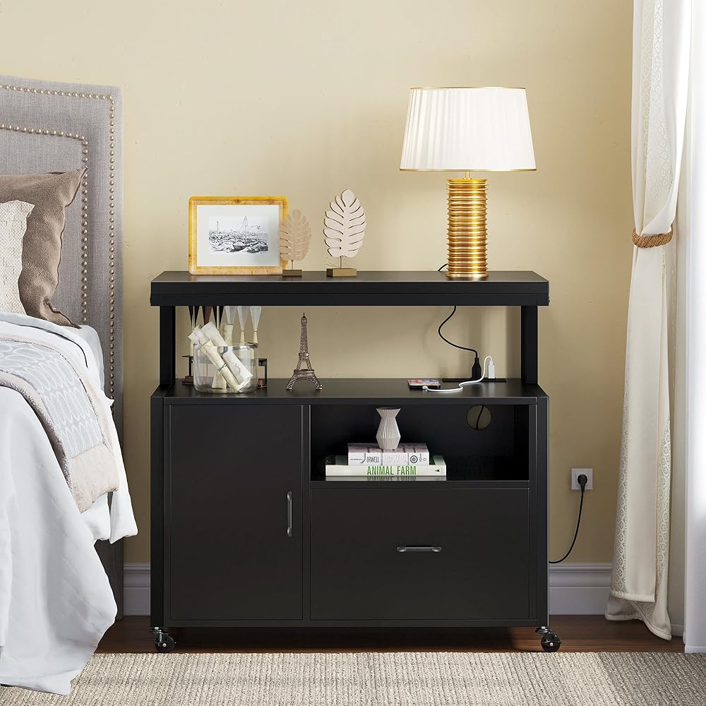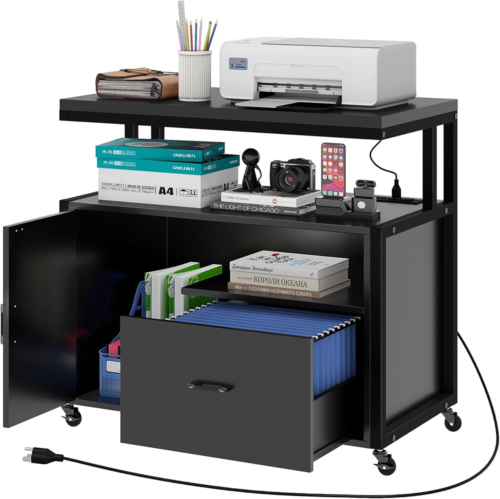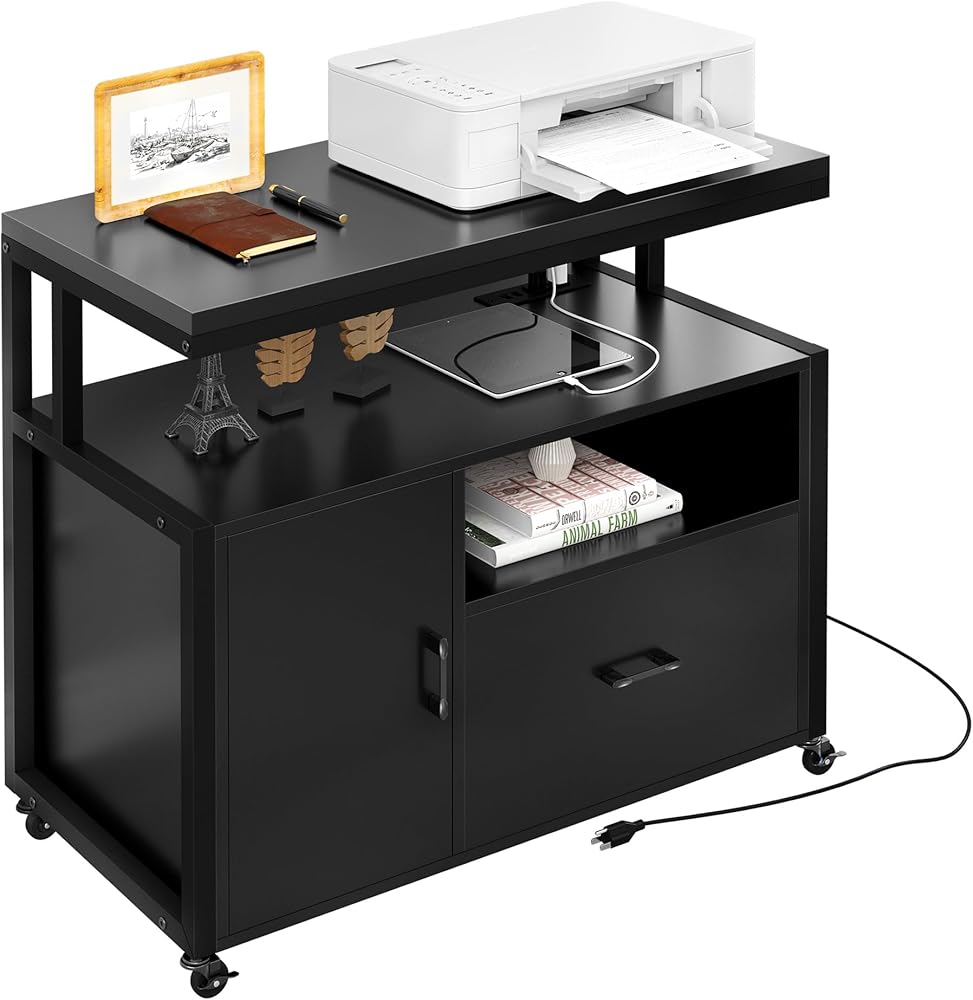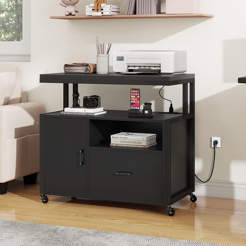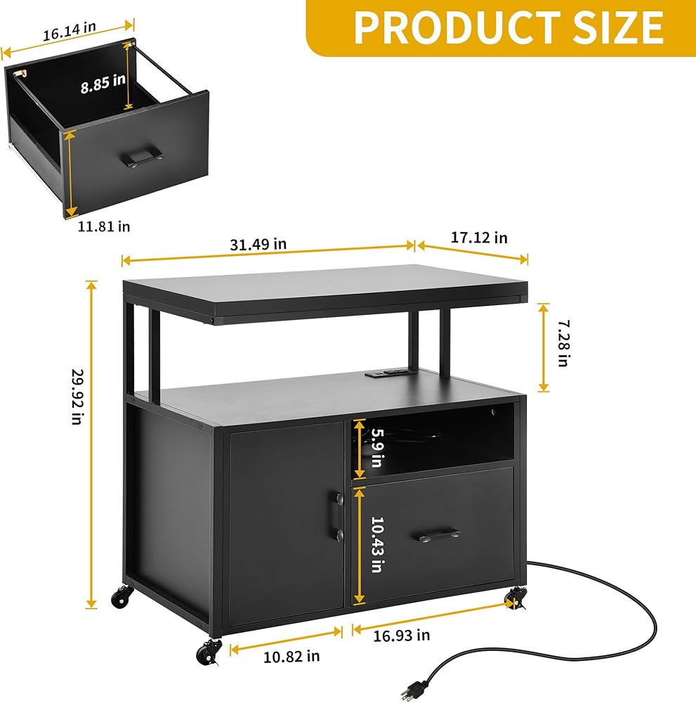 موقف طابعة مكتب DWVO مع عجلات وجداول الطابعة مع درج الملفات ونشر الشحن ، خزانة ملفات جانبية متنقلة مع رف تخزين مفتوح لرسالة/قانوني/ملفات الحجم ، الأسود