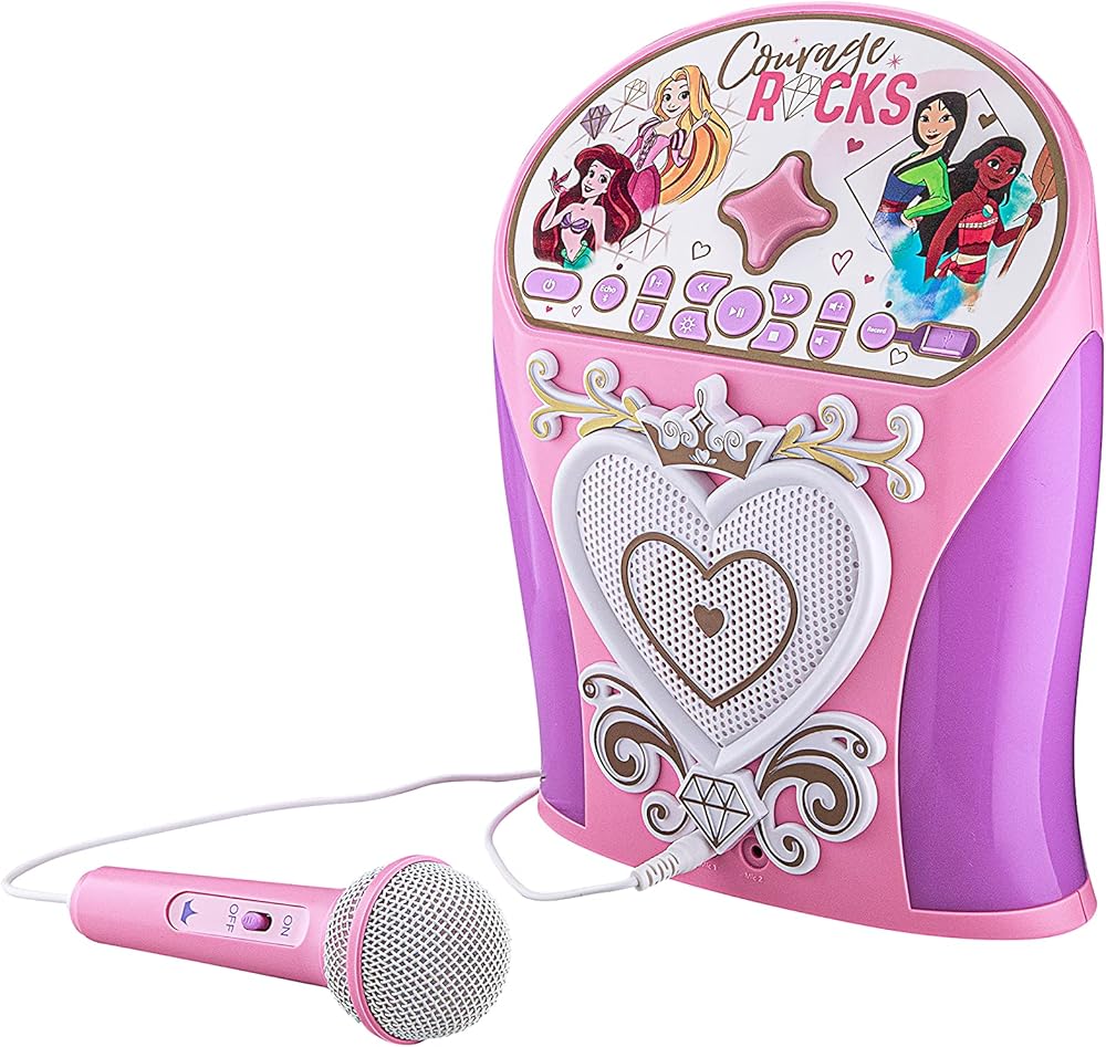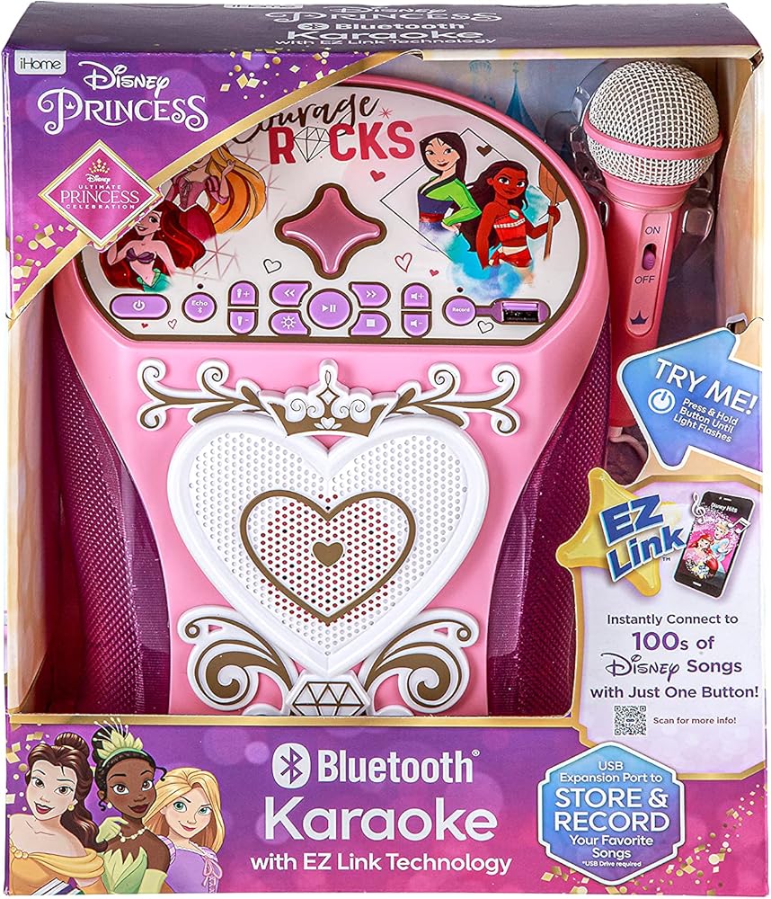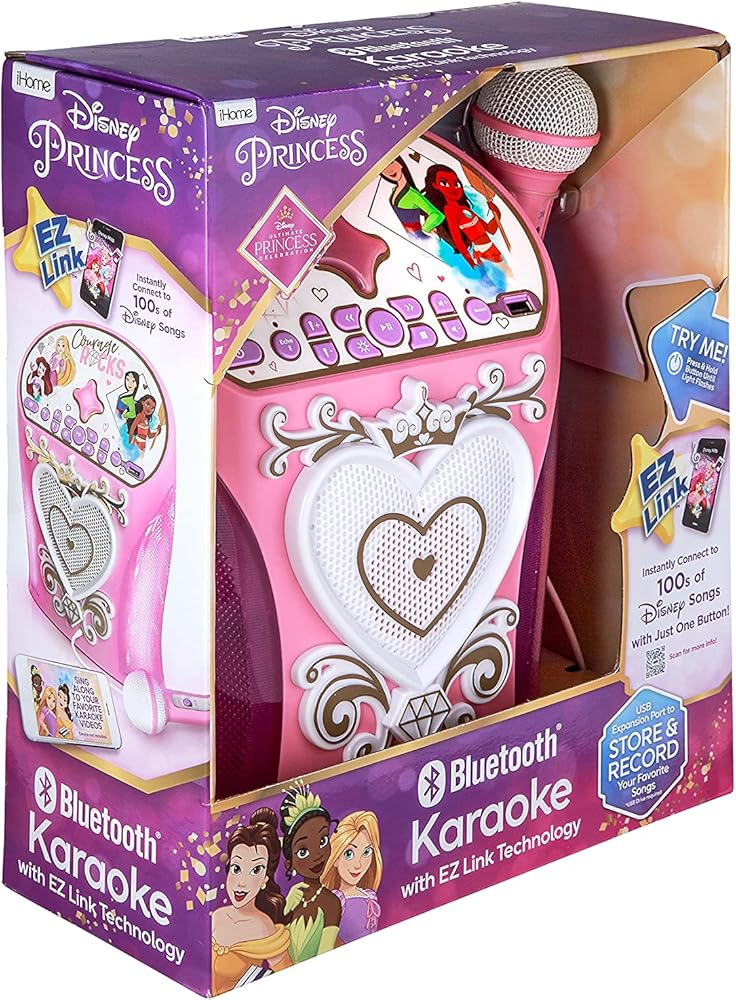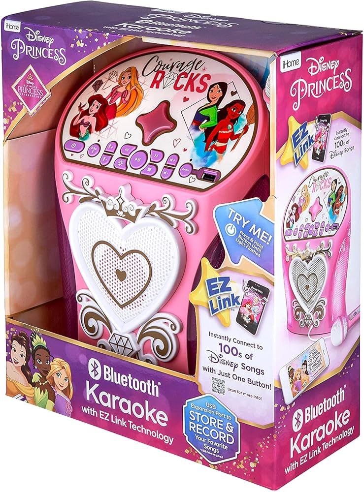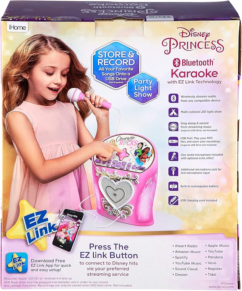 Stream and sing along to all your favorite Disney music when you connect this karaoke machine to any Bluetooth-enabled device, including smartphones, tablets, and computers. Use the included wired microphone to perform your favorite songs, then record and save your "hit single" onto a USB drive (not included). Download the EZ Link app from the App Store or Google Play and install it on your Bluetooth device, then follow the prompts to select streaming service. Once activated, you can press the EZ Link Button on your karaoke machine and use your microphone to seamlessly connect and play a great collection of Disney hits. Product Features: Wirelessly stream audio from any compatible device Sing along and record from streaming music (USB drive required) One wired microphone included Multi-colored LED light show Connect to Disney Hits via EZ Link (app required) Includes a Karaoke unit, USB charging cable, and an instruction booklet