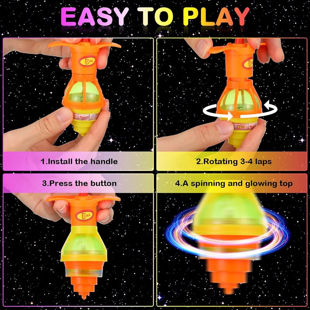• سهل ومضحك: من السهل تشغيل لعبة ضوء الدوار الوامضة ، تحتاج فقط إلى إرفاق الجيروسكوب إلى الأعلى ولف المقبض 3 مرات ثم اضغط على الزر ؛ بعد ذلك ، ستدور ألعاب الدوران هذه وتتوهج ، وهو أمر مضحك للغاية ومناسب للعب مع الآخرين