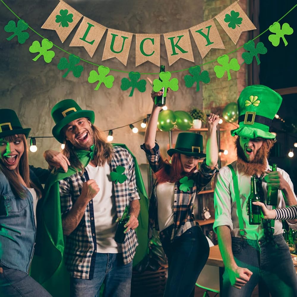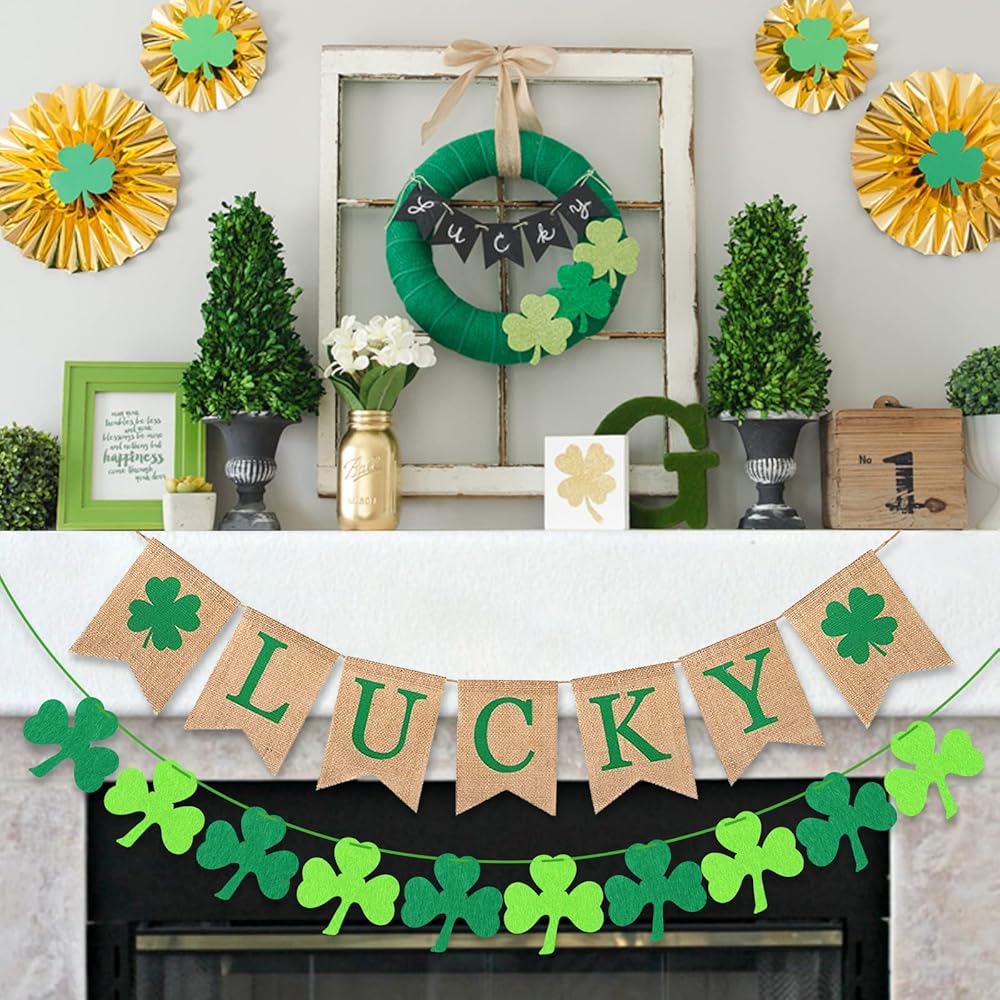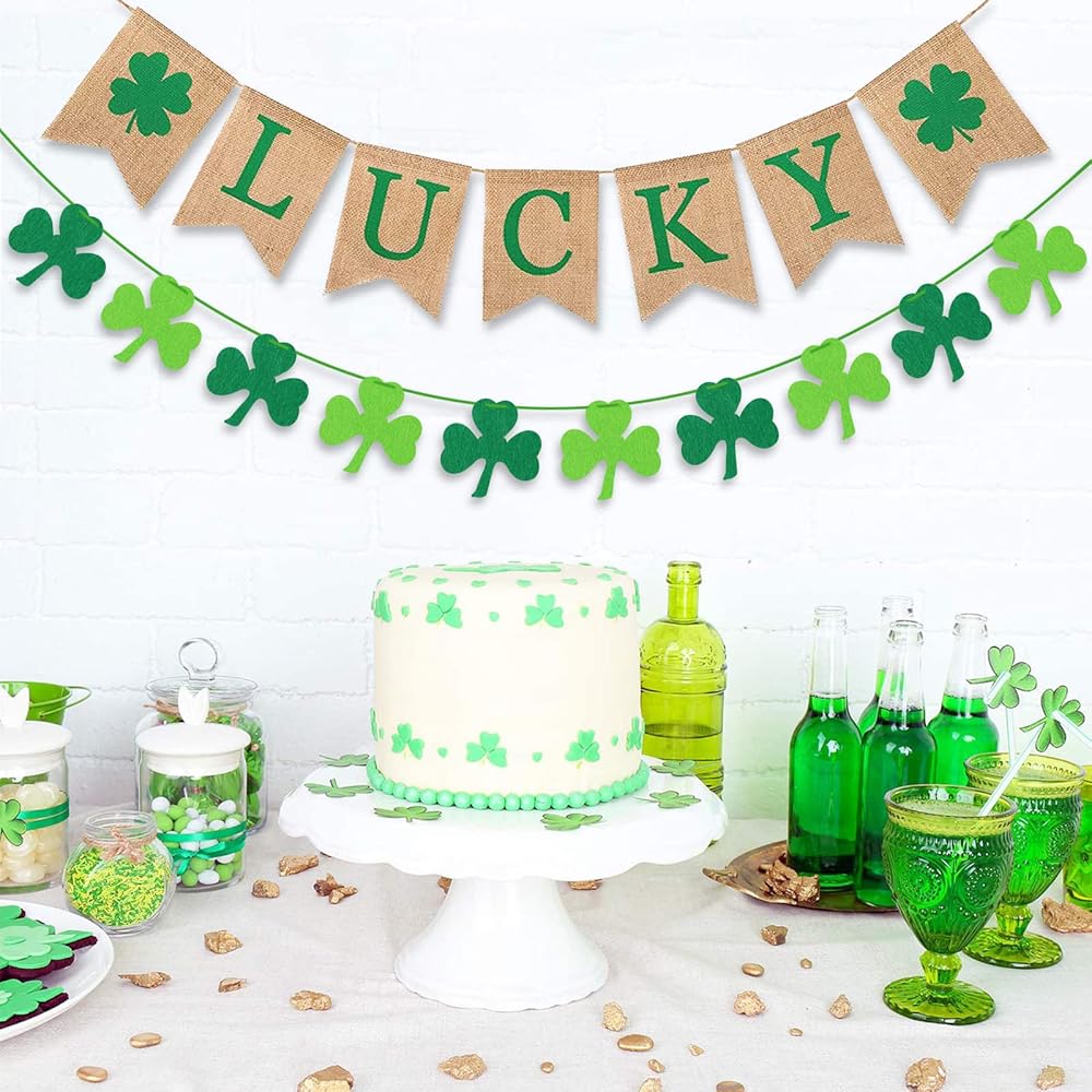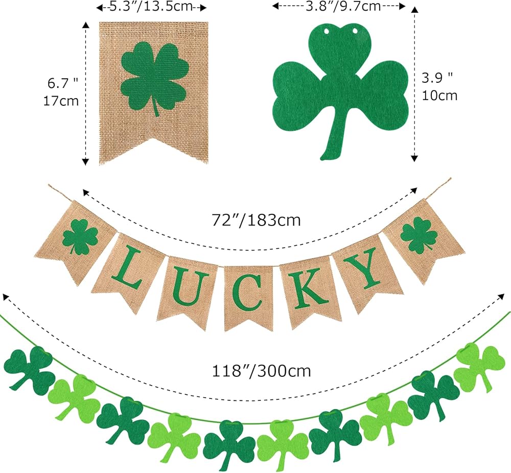 【St. Patrick's Day Banners Set】Package includes 1x burlap LUCKY letters banner & 1x green shamrock felt garland.