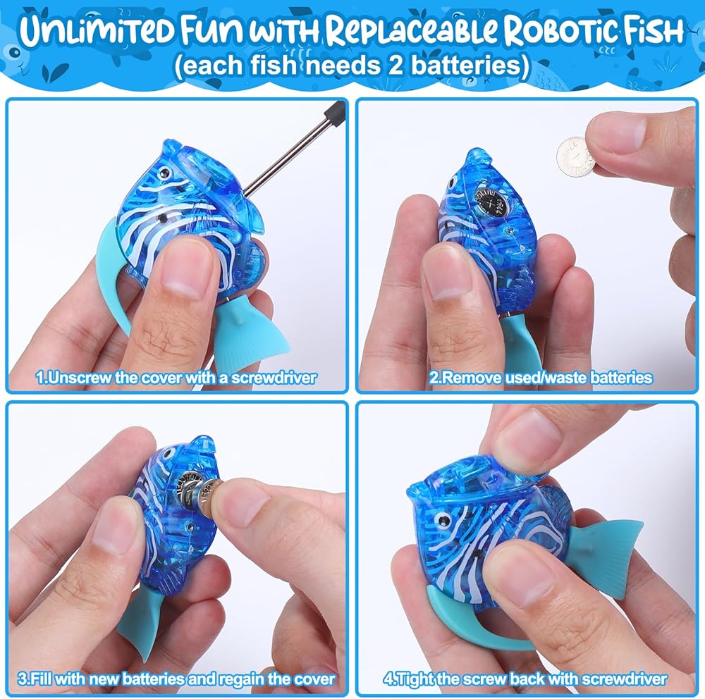 إشعار: يمكن للأسماك الآلية السباحة في الماء ولكن لا تنقع لفترة طويلة. إذا كانت الأسماك تتحرك ببطء أو تتوقف عن العمل ، فيرجى محاولة إزالة البطارية وإعادة تثبيت أو استبدال بطارية جديدة متصلة في الحزمة