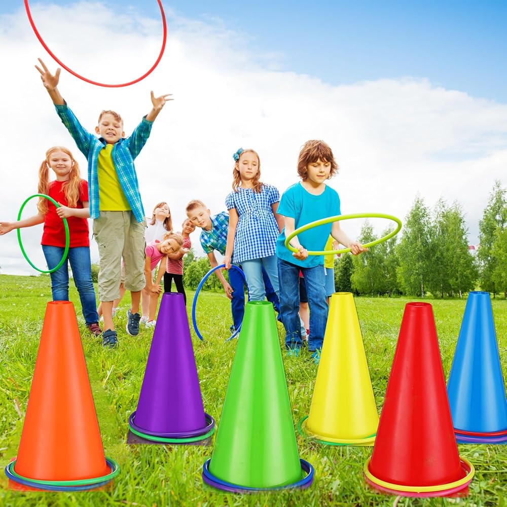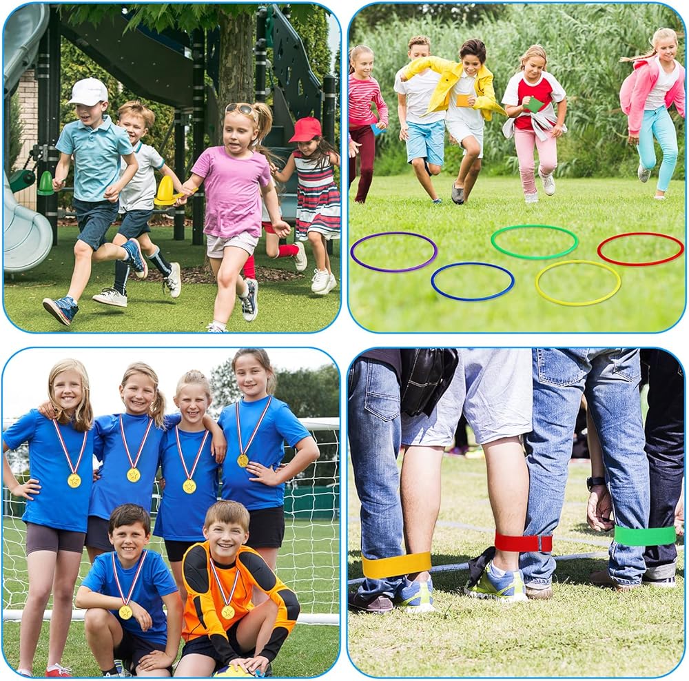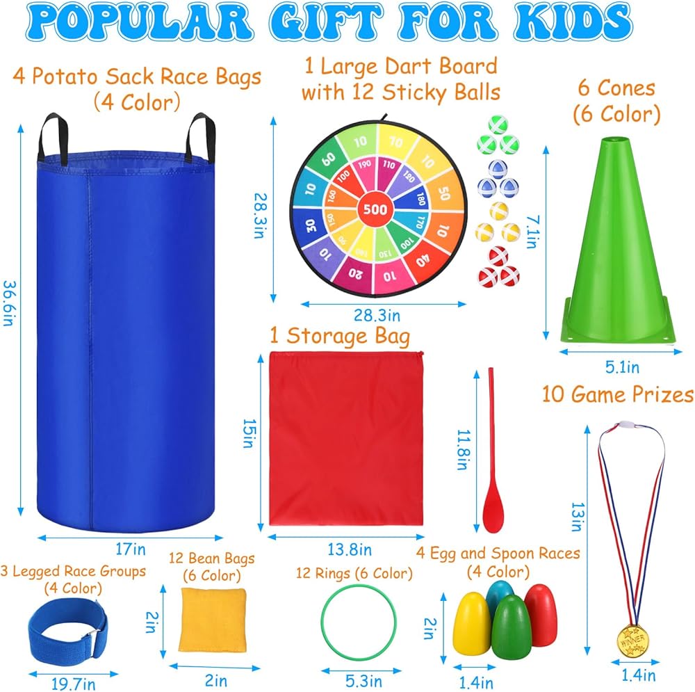 • Easy to Play: place the cones on the ground, you can use toss rings or bean bags to throw; The potato Sack Race Bags are large enough for adults to use, pull up the handles on both sides with both hands and jump forward to start the game; The dart board is easy to expand and fold, the surface can be easily attached to the matching sticky ball. Different colored toys can distinguish teams, and medals can be used to award winners