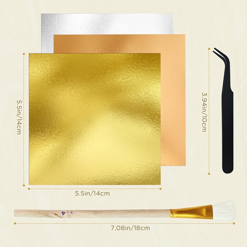 • Packing List:Enhance your crafting versatility with our comprehensive gold leaf kit. Includes 150 sheets of gold foil sheets(50 sheets of each color),a handy tweezer, and a gilding brush—everything you need for flawless application on furniture, painting, resin, and more
