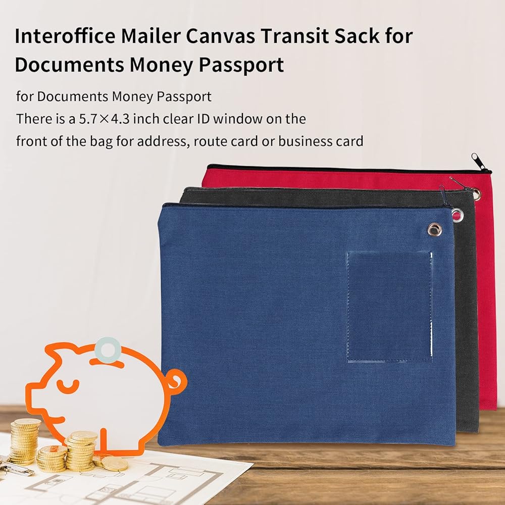 Dostatni 3 قطع 14 × 11 بوصة حقيبة بنكية سوداء كبيرة مع حقيبة إيداع بنك Zipper Red مع Grommet Blue Interoffice Canvas Transit Sack for Documents Money Passport