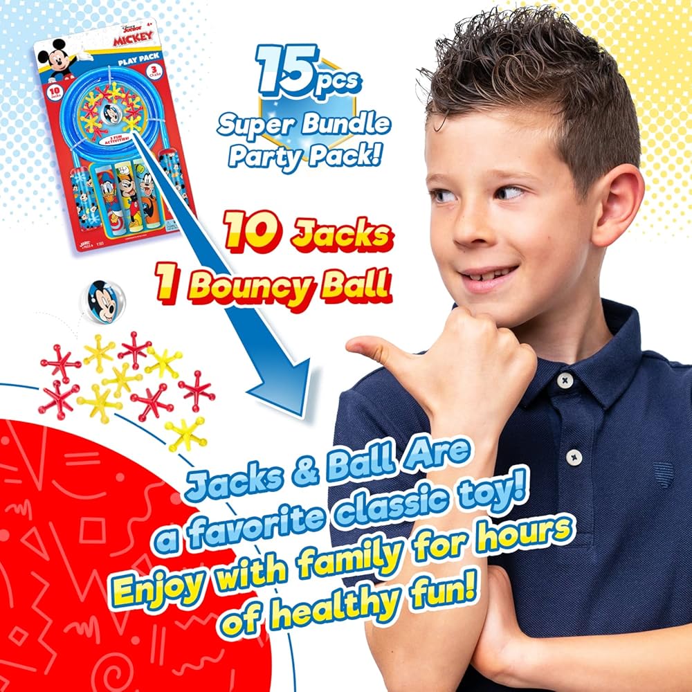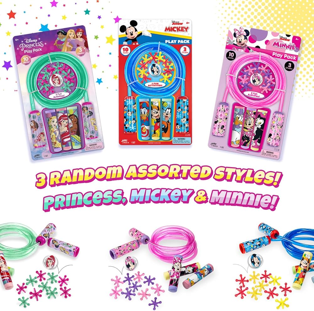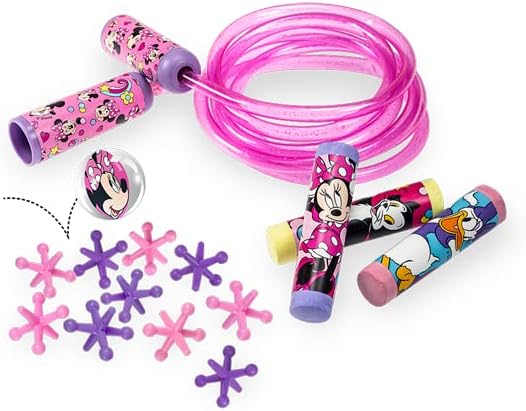 1 Pack of Disney Toy Bundle Set (3 Games In One Pack) - Each bundle pack includes 3 toys; 1 adjustable kids jumping rope, 1 classic retro jacks game w/ rubber bouncy ball, and 1 pack of 3 colorful sidewalk chalk. All toys have beloved Disney Minnie Mouse character designs. Includes 1 Funaton Sticker.
