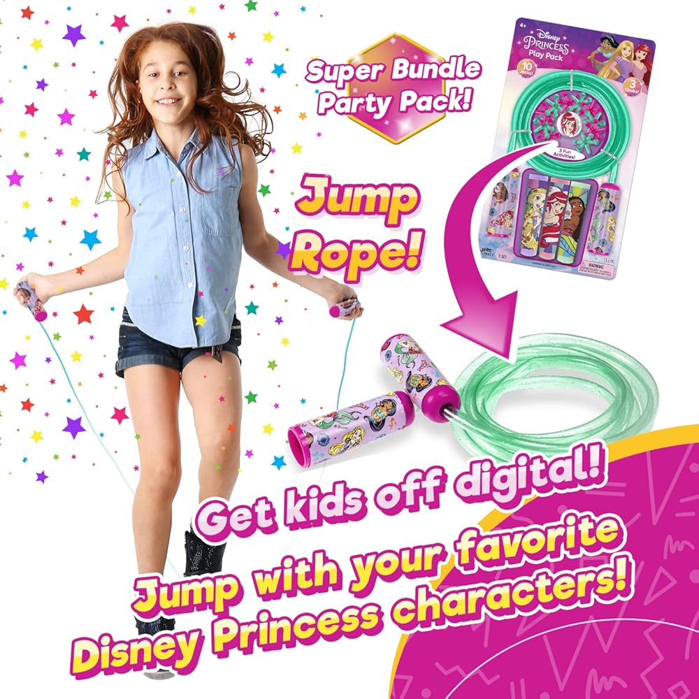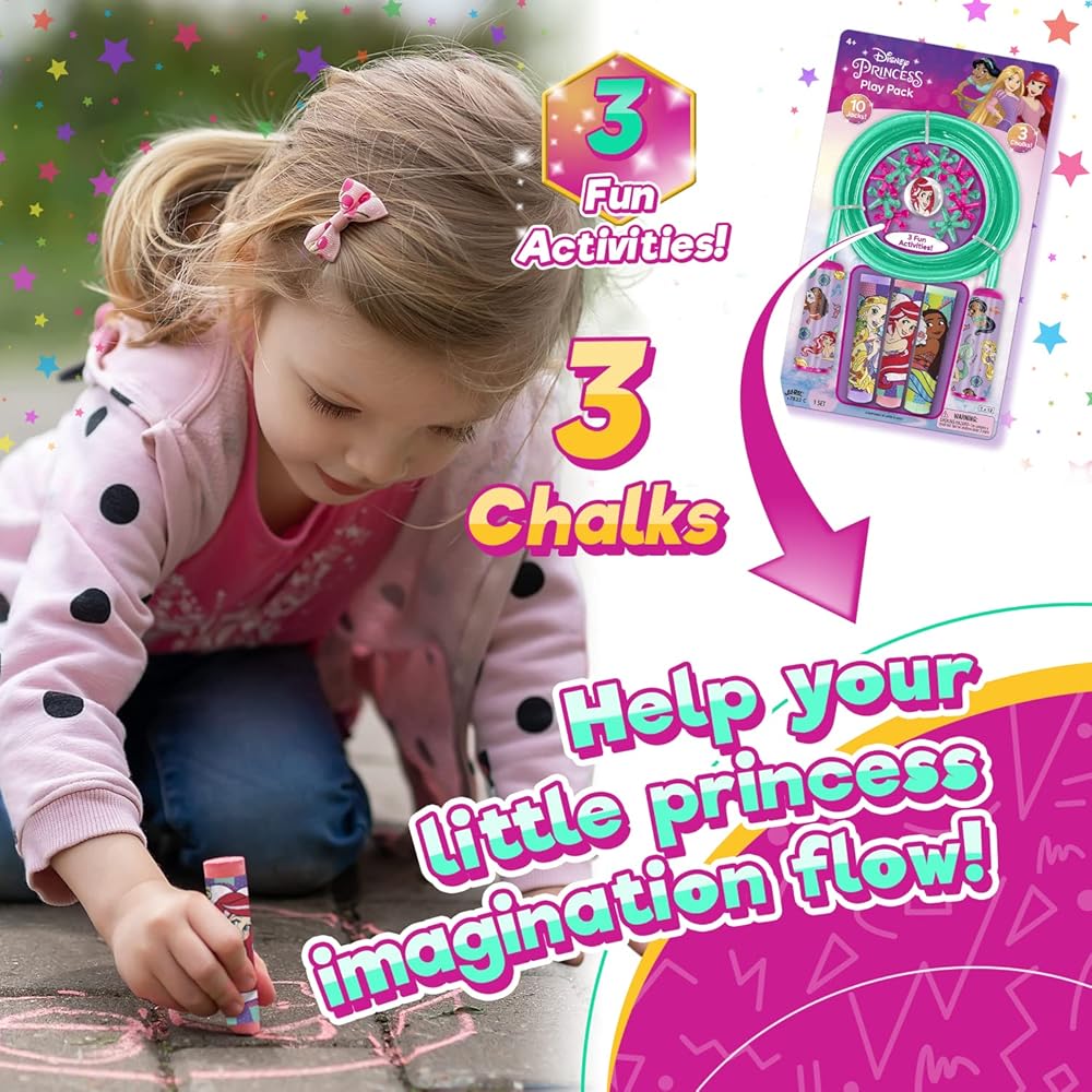 Disney Junior & Princess Toy Set. Great Bundle for gifts and prizes. 3 Games: Jacks Classic Ball Game, Adjustable Jumping Rope and Colorful Chalk Sticks. All in one pack. Disney Unique Design & Easy To Use. Our Sidewalk Outdoor Chalks will allow your children to get outside and play, give them the opportunity to bring all kinds of artworks outside. Each chalk will give vibrant colors onto any driveway or sidewalk. The chalk can be washed off any surface. Easy Hand Grip Color Stix Wheel. The rubber balls and Rubber jacks are easy and safe to handle and fun to play with. Super Fun for Family Games & Birthday. Cool indoor games for kids to reduce screen time and improve brain power. With every successful pick and catch, kids get to develop hand-eye coordination. Quality & Comfort- Plastic handles and the rope is filled with cool rainbow colors shiny sparkling confetti. Durable jumprope materials that will last and last, and comfortable handles with smooth surface that are easy for kids to hold- Skipping Rope. Cuerda de saltar.