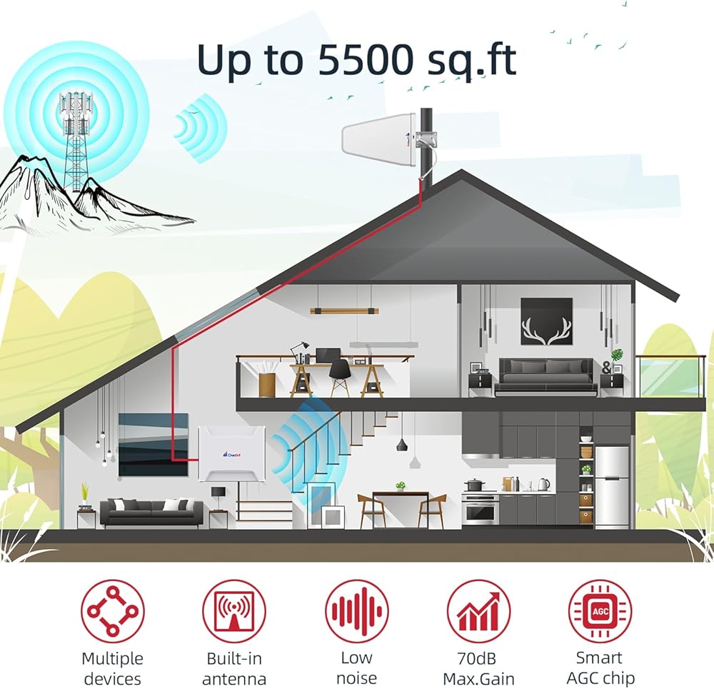 🏕️ ارفع مستوى تجربة إجازتك! سواء كنت تهرب إلى كابينة خشبية هادئة على ضفاف البحيرة أو إلى فيلا قرية جبلية ساحرة، فإن معداتنا مصممة خصيصًا لك. مع هوائي لوغاريتمي خارجي عالي الكسب ومعزز بهوائي مدمج، يمكنك تضخيم الإشارة الخاصة بك في أي مكان بالداخل. ابق على اتصال بسلاسة واصنع ذكريات لا تُنسى في واحة الإشارة الخاصة بك.