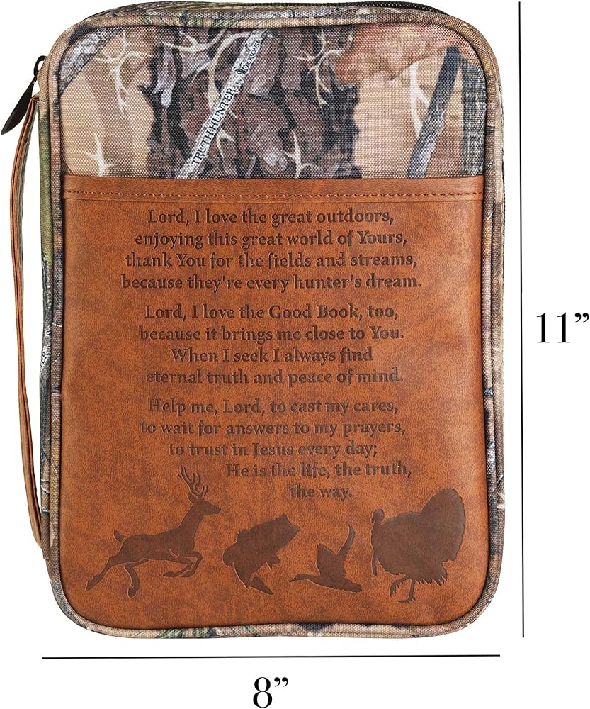 • Bringing classic style and charm with a sleek design; This Bible cover boasts a vinyl stamped pocked with "Hunter's Prayer" and accenting camouflage pattern