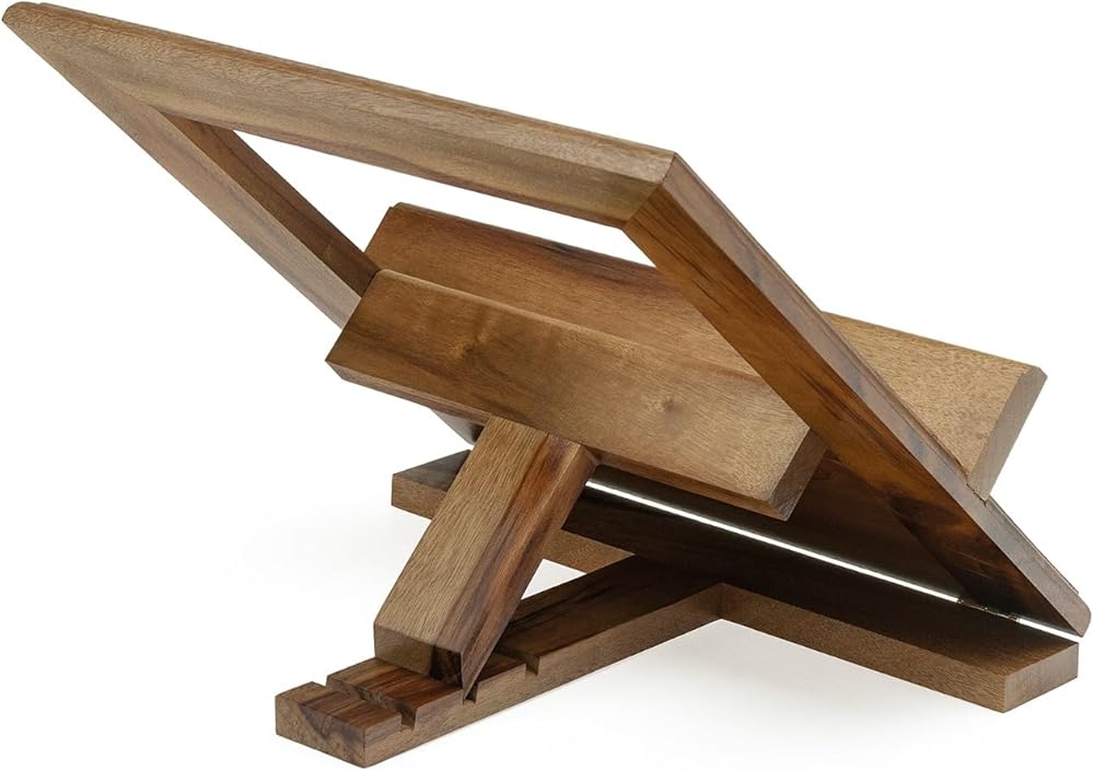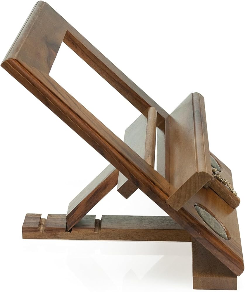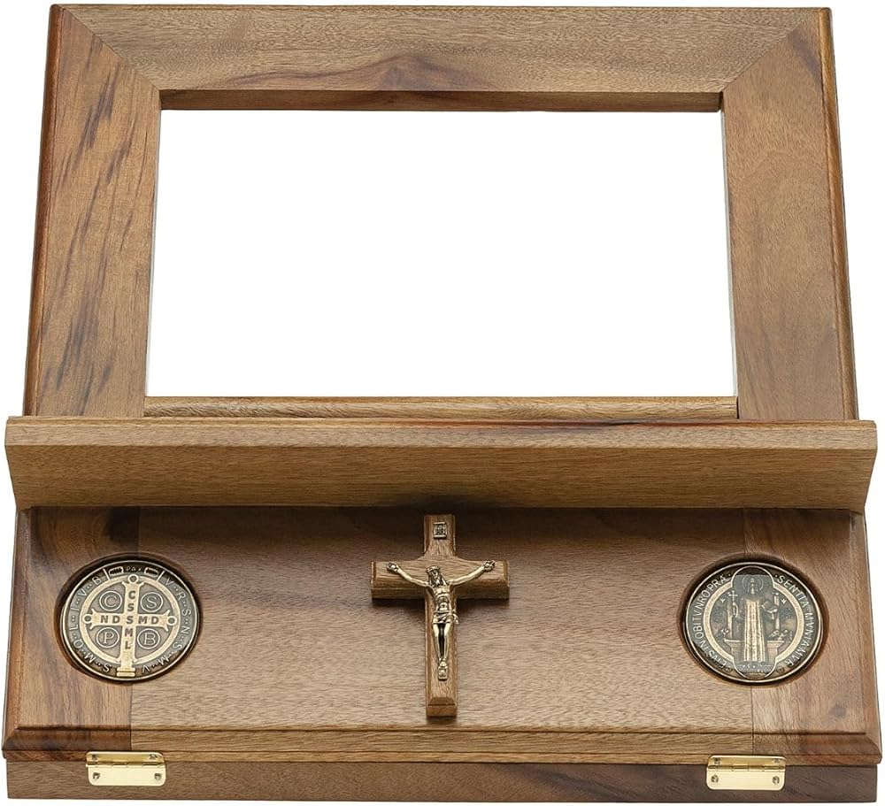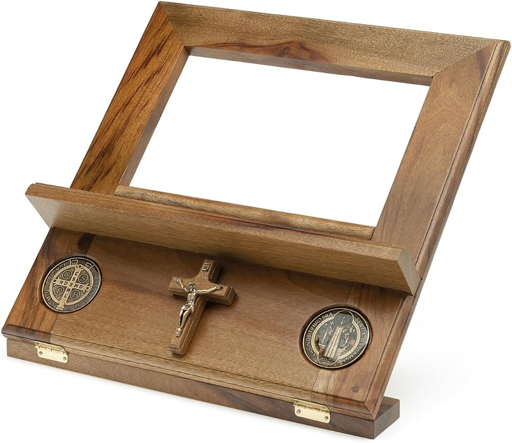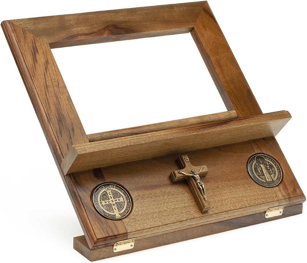 Elevate Your Scripture with Faith and Flourish: The Handcrafted Sanctuary Crafted from highly polished Brazilian walnut and sculpted by hand, this exquisite Bible stand isn't just a place to rest your sacred text; it's a sanctuary for your faith. Uniquely adorned with a gleaming crucifix and intricately inlaid St. Benedict medals, this stand offers subtle reminders of divine protection and grace as you delve into the word of God. Far from the cold uniformity of mass production, this handcrafted masterpiece reveals the unmistakable artistry and unwavering dedication woven into every line and curve. The smooth, hand-sanded finish whispers of reverence for the scripture it supports. At the same time, the walnut's inherent strength and timeless beauty ensure that this heirloom will faithfully serve generations to come. Give the gift of a sanctuary: Whether for yourself or a cherished loved one, this exceptional Bible stand is a tangible expression of faith that will nurture daily scripture study and inspire quiet moments of prayer. Embrace the sacred. Embrace the handcrafted. Embrace The Sanctuary. Features: Solid Brazilian walnut for unparalleled beauty and durability Handcrafted by skilled artisans for enduring quality and unique character Gleaming crucifix and inlaid St. Benedict medals for constant reminders of faith and protection Smooth, hand-sanded finish for a touch of reverence Not mass-produced, a true one-of-a-kind treasure Invest in a sanctuary for your faith. Order your Handcrafted Sanctuary Bible Stand today.