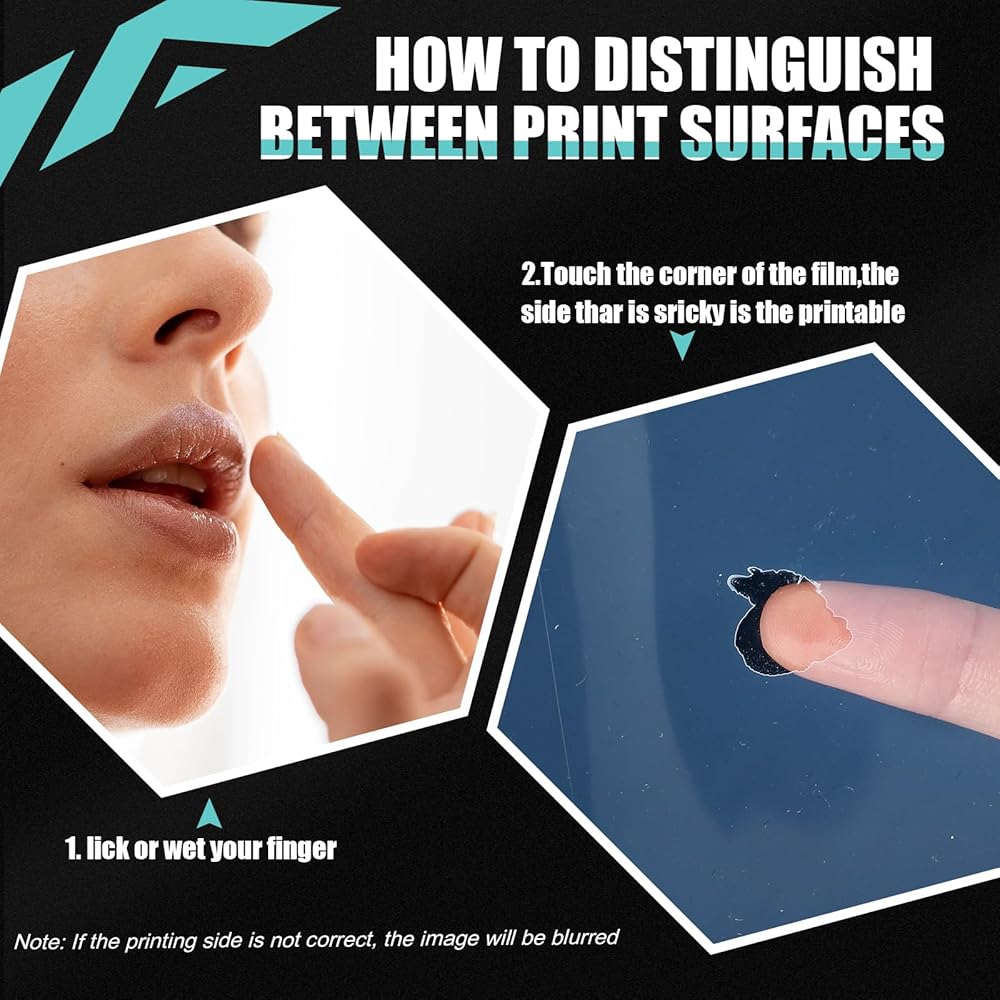 How to Use: how to find the printable side of this waterproof inkjet film, lick or wet your finger and touch the corner of the positive transparent paper, any side that looks sticky is the printable side, if the printing side is not correct, the image will be blurred