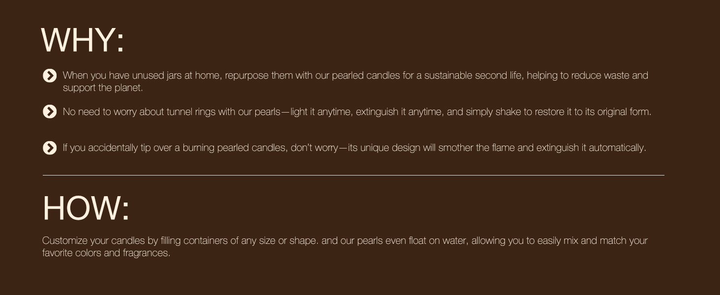 الوظيفة: شموع بيرول تعمل بشكل مشابه للشموع التقليدية. صب مسحوق الشمعة في حاوية مقاومة للحرارة ، وإدراج فتيل ، وإضاءة. شمعة بيرول حول الفتيل لإنتاج الضوء. الأهم من ذلك ، أن الشموع يمكن أن تضعف ذاتيا إذا تم تربيتها ، حيث تنهار اللؤلؤ وتخرج من اللهب