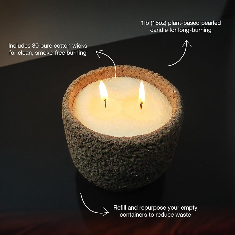 تكوين المواد: شموعنا المصنوعة من شمع اللؤلؤ القائم على الشمع. يوفر هذا التكوين تجربة محترقة نظيفة مع الحد الأدنى من الدخان ، مما يجعلها أكثر راحة للاستخدام الداخلي