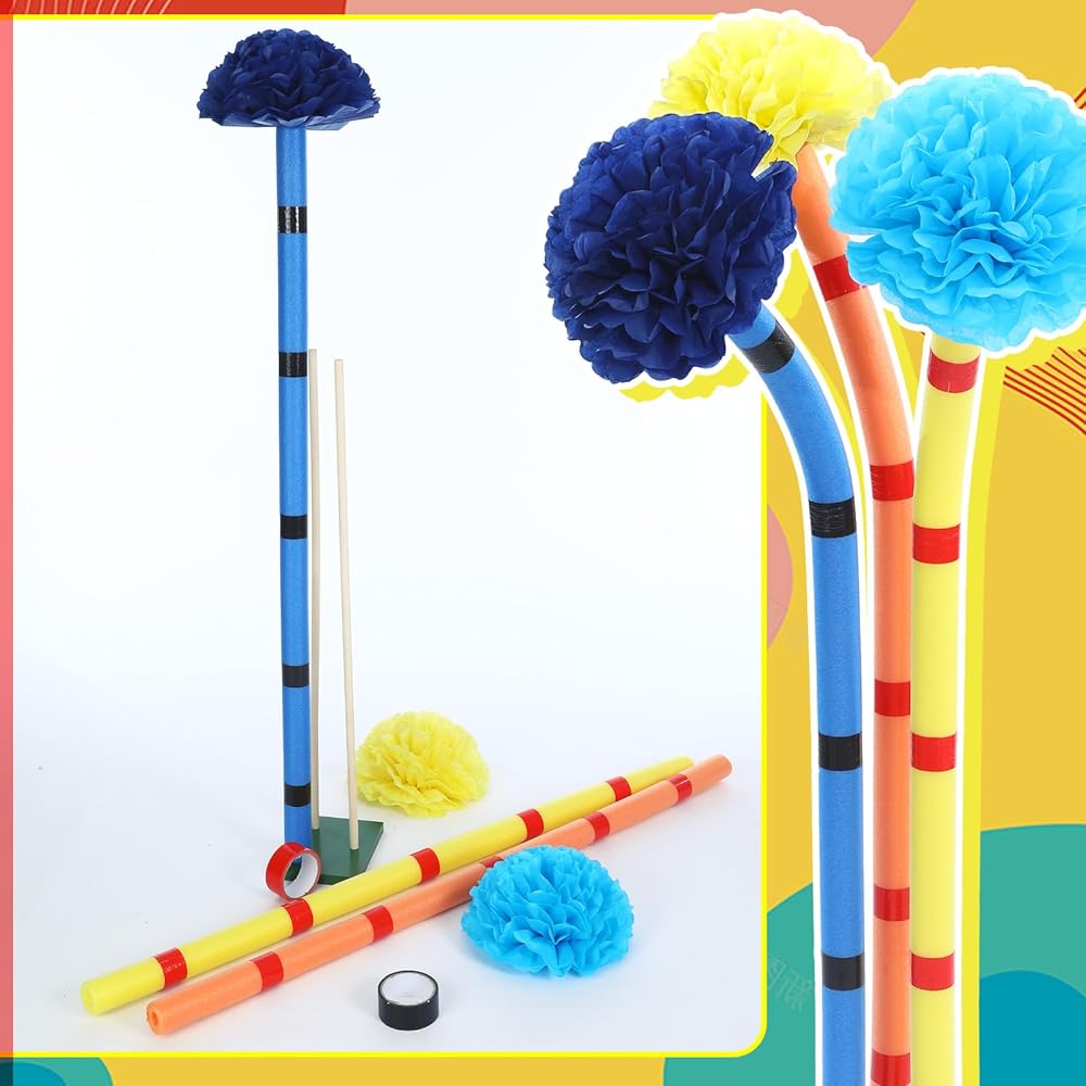 • Quality Material: our color pompoms are made of craft paper, fluffy and full, tape after opening is strong, easy to peel off; Pool noodles are made of pearl cotton, not easy to break or deform, safe and have good resilience and toughness, suitable for children's various DIY projects; The base is composed of wood, which is strong and reliable and can be applied for a long time