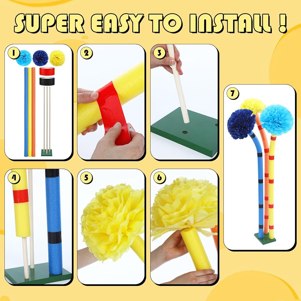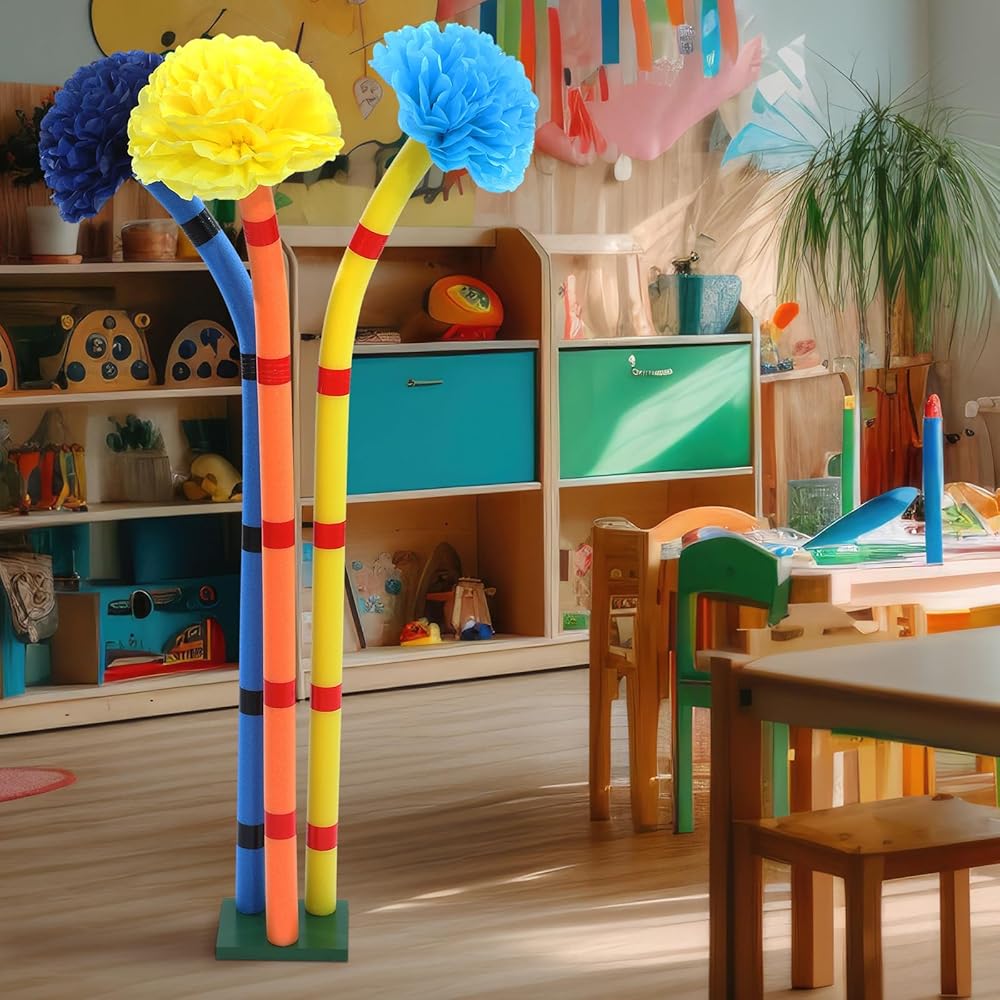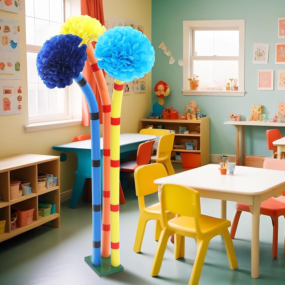 • DIY Operation is Simple: our base is detachable and only requires the wooden stick to be installed in the hole of the green board; The pool noodles are hollow and fit on top of the base; Colorful pompom paper flowers are glued to the pool noodles to make the furry tree look more realistic