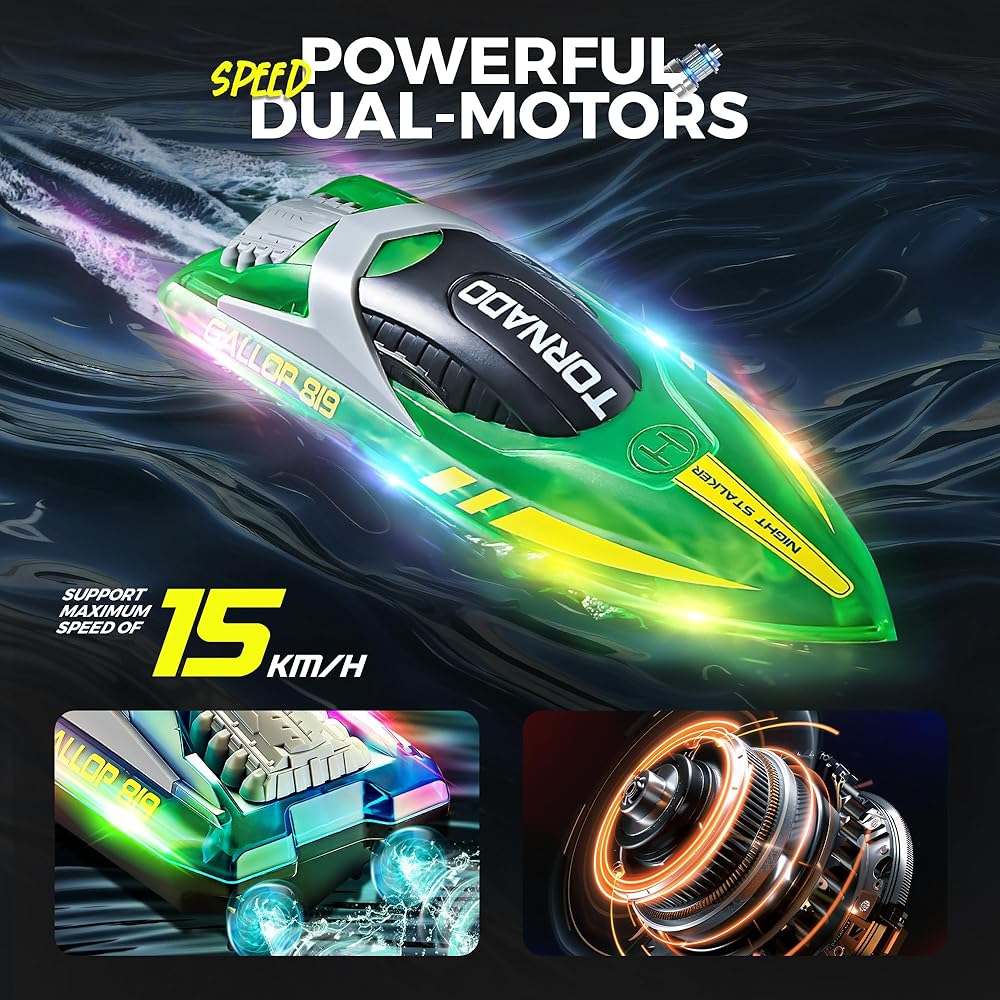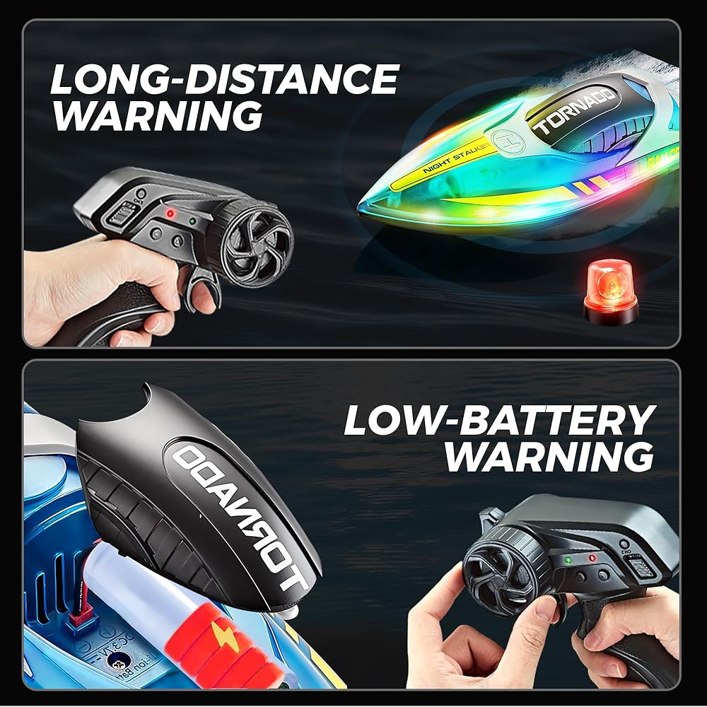 مصابيح LED ذات الأربعة ألوان: يتميز قارب التحكم عن بُعد بقشرة شفافة مزينة بأضواء LED بأربعة ألوان ، مما يوفر أوضاع إضاءة متنوعة لتحسين الجاذبية البصرية والوظائف. يمكن ضبط الأنوار على وضع ثابت أو وضع وميض أو إيقاف تشغيله تمامًا ، مما يسمح للمستخدمين بتخصيص تجربتهم. يمكّن هذا التنوع من الاستمتاع بوقت التحكم عن بُعد خلال النهار وفي الليل ، مما يضيف بعدًا مثيرًا لأي مغامرة مائية.