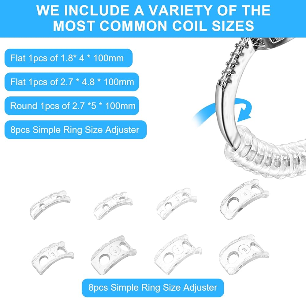 • 【 Ring Size Adjuster Set】Each set includes 8 insert-style and 4 spiral ring adjusters, 1 polishing cloth, and 1 box, offering convenience and security. With two styles to meet all your needs, these ring adjusters can effectively reduce ring size by 0.5-1 size, accommodating ring widths from 1-10mm. Say hello to perfectly fitting rings!