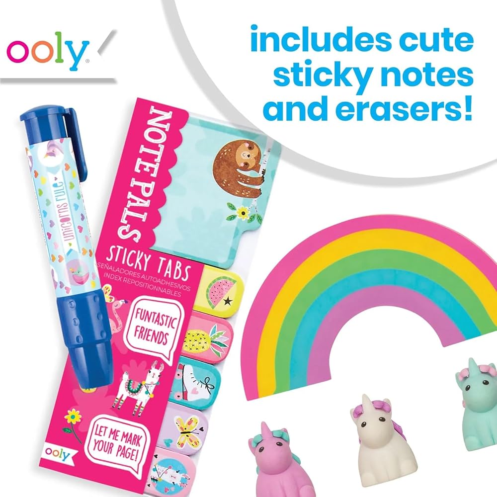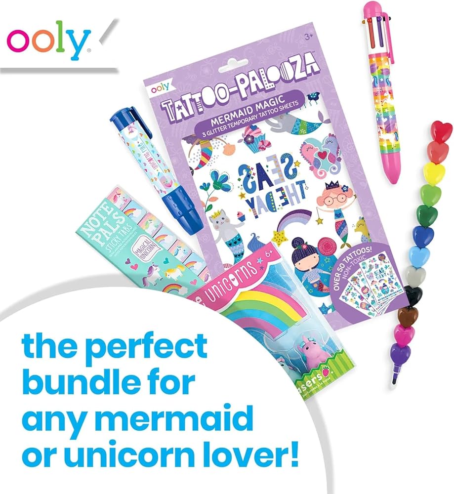Oh my! What have we here? More unicorns and mermaids than you can handle? Maybe not, but there is a lot! From crayons to stickers, and erasers to clickers, you'll be spoiled when choosing the Oh My! Unicorns and Mermaids Happy Pack. This pack is so full of creative goodies, you will have a tough time choosing what to use! The bright Heart to Heart stackable crayons are great fun to color with. While the strawberry scented unicorn erasers are great to play with and use to erase! And if you need a more pencil-like eraser, you can get crafty with the Unique Unicorns Clickit Eraser too. And while this may all sound magical, you will love the Unique Unicorns 6 Click Pen with 6 amazing bright colors in one pen! And then to top it all off, the set includes a set of mermaid themed temporary tattoos.! Of course, parties need gifts and this pack is a great simple gift or party favor. *Stacking Crayon Design May Vary 12 colored Heart to Heart Crayonsthat can stack easily for easy packing Unique Unicorns Strawberry Scented Erasersare fun to play with and use Magical Unicorns Note Pals Sticky Tabshelp keep your notes and reminders in place Unique Unicorns 6 ClickPen has 6 different colored ballpoint inks* Unique Unicorns Clickit Eraserfor creative control in a click* Tattoo-Palooza Mermaid Magic temporary tatoosrelease a delicious cupcake scent when scratched *all styles may not be available as pictured, a comparable substitution may be made