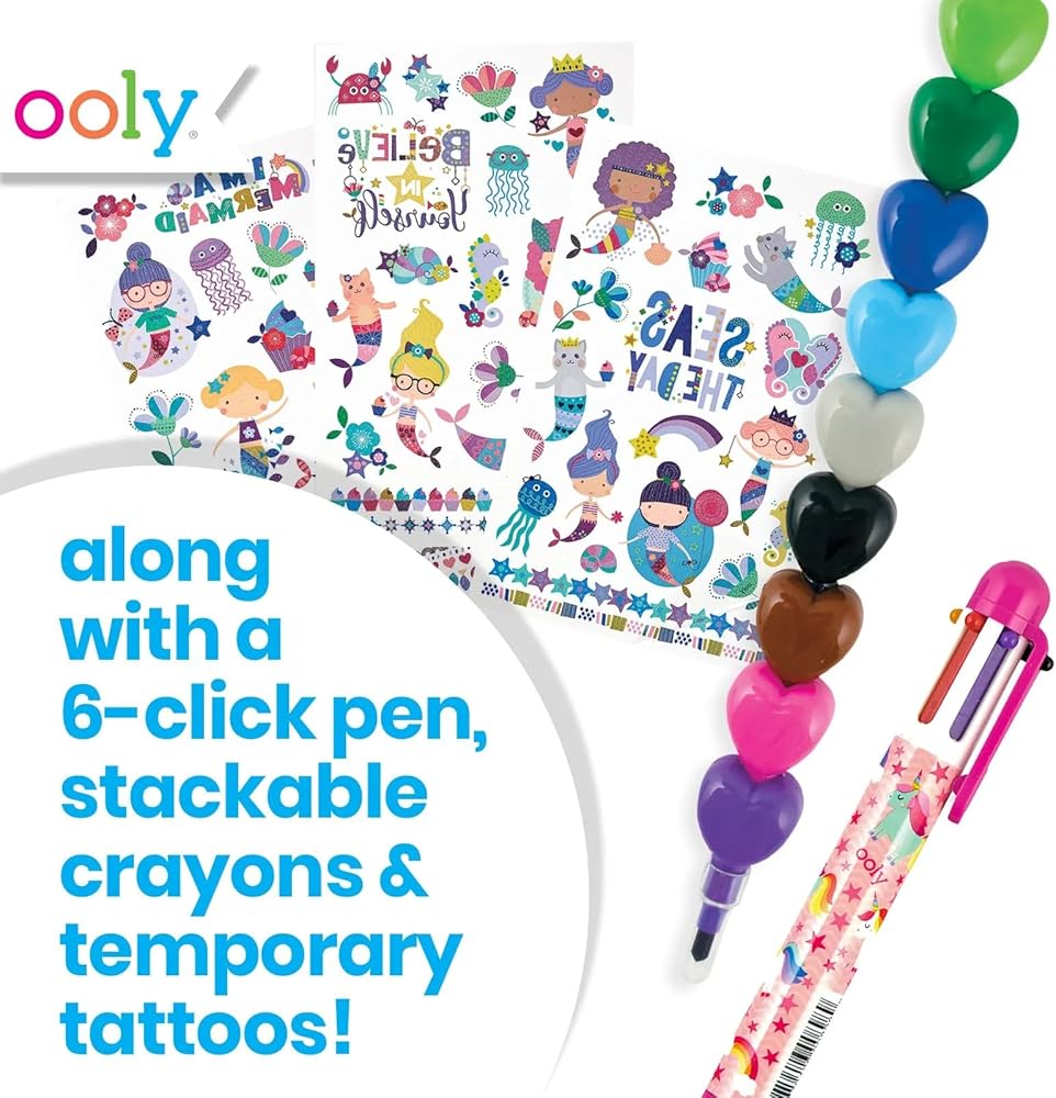 12 colored Heart to Heart Crayons that can stack easily for easy packing| Unique Unicorns Strawberry Scented Erasers are fun to play with and use| Magical Unicorns Note Pals Sticky Tabs help keep your notes and reminders in place| Unique Unicorns 6 Click Pen has 6 different colored ballpoint inks*| Unique Unicorns Clickit Eraser for creative control in a click*| Tattoo-Palooza Mermaid Magic temporary tatoos release a delicious cupcake scent when scratched|*all styles may not be available as pictured a comparable substitution may be made