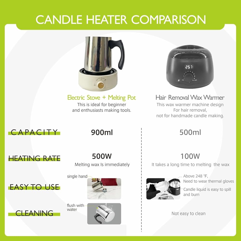 • 🎁【 مجموعة صنع الشموع تشمل】 مجموعة من طقم صنع الشموع تشمل 1x 500W موقد كهربائي ، وعاء ذوبان شموع 1x 900 مل ، ملعقة 1x التحريك ، مقياس حرارة 1x ، فتيل شمعة 20x ، وسادات مضادة للطفرات 1x ، ووحدات غراء 20x ، و 10 أضعاف فتيل ، 1x مستخدم يدوي.