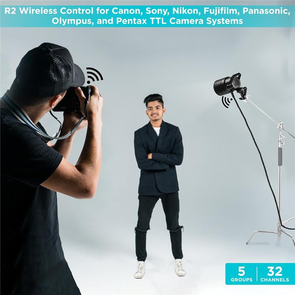 التوافق: تحكم لاسلكي R2 متوافق مع كاميرا Canon/Nikon/Sony/Panasonic/Fujifilm TTL. يضيف هذا الفلاش اللاسلكي القوي تنوعًا إلى مجموعة إضاءة استوديو التصوير الفوتوغرافي الخاصة بك