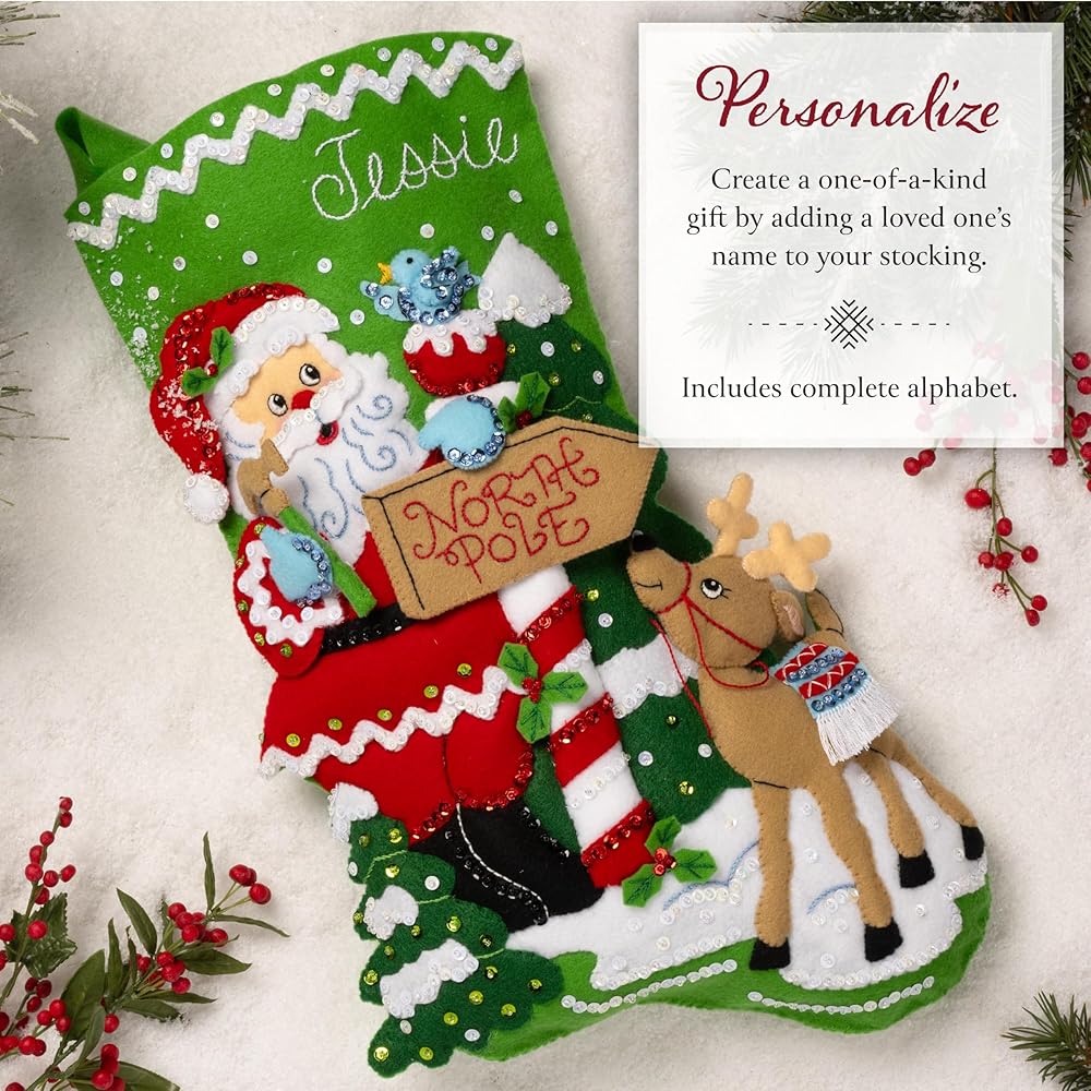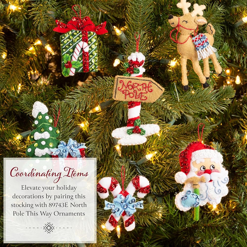 CLASSIC STOCKING – This 18" felt applique stocking is the perfect embroidery kit for your holiday décor. Fill this stocking with your favorite stocking stuffers to make the holidays special.