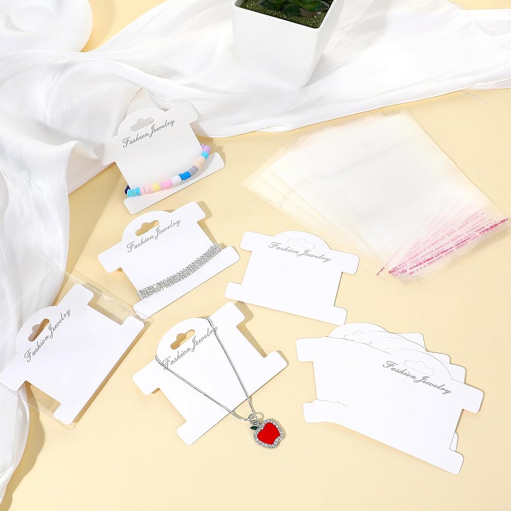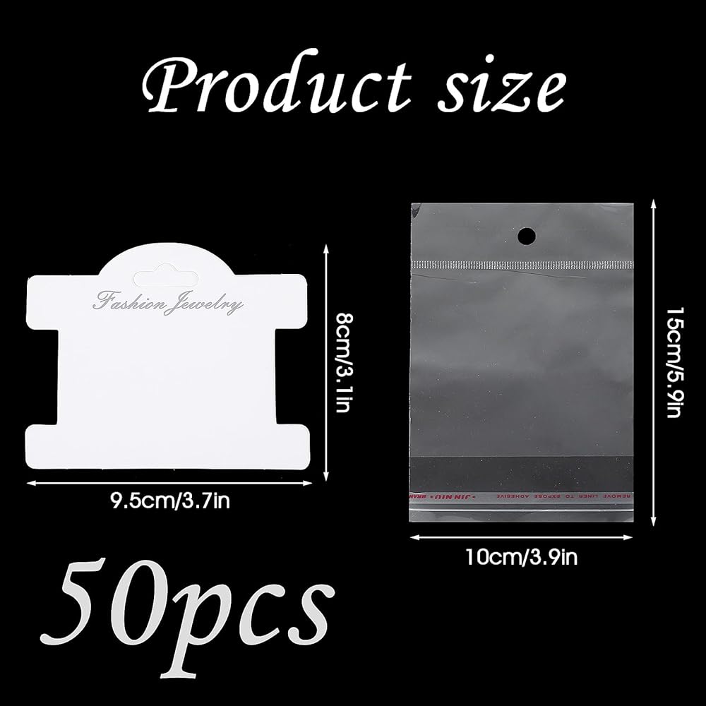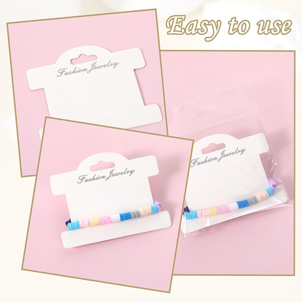 【Jewelry Display Clear Bags Set】Package includes 50pcs bracelet display cards and 50pcs self-sealing clear bracelet packaging.The size of paper display cards is 3.7" x 3.1"/9.5cm x 8cm, and the size of each clear bag is 5.9" x 3.9"/15cm x 10cm.