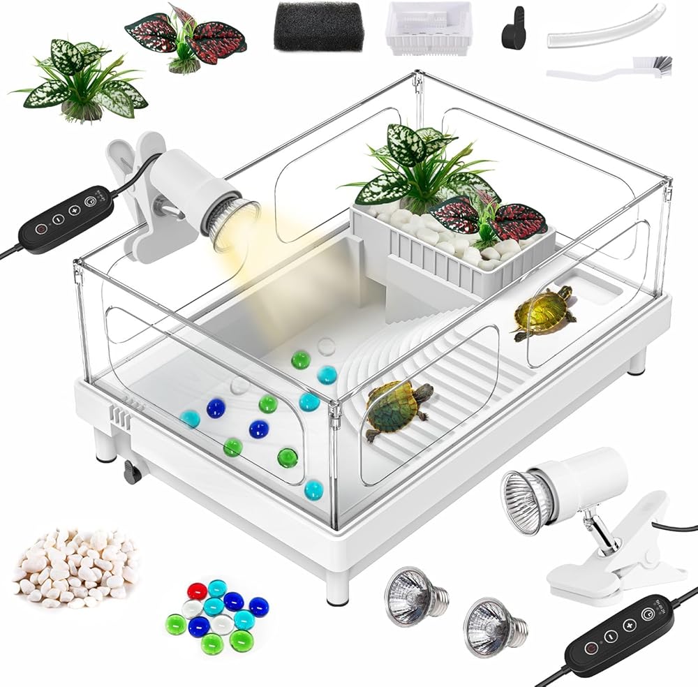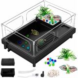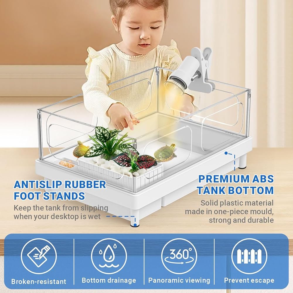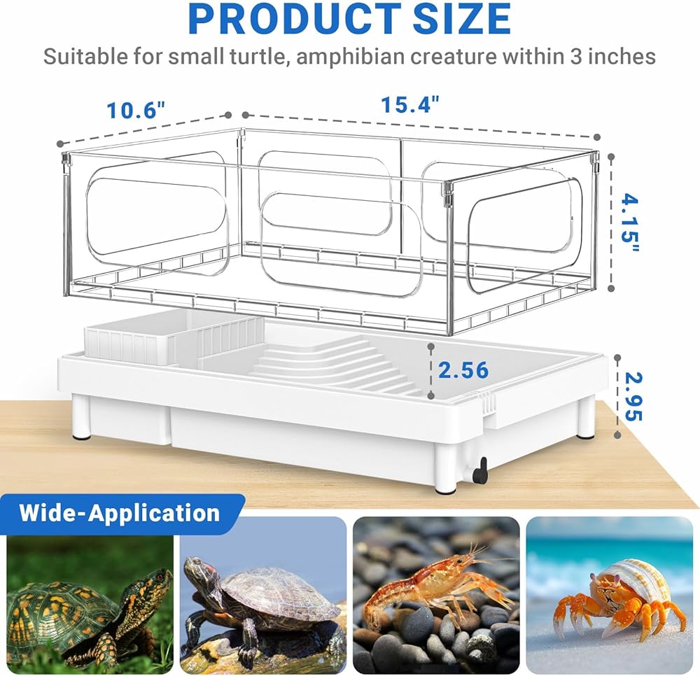 • 【خزان مضغوط ومساحات وظيفية متعددة】 هو حجم terrarium السلاحف هو 15.4 "× 10.6" × 7.1 "لتوفير مناطق السباحة والتسلق والراحة وتغذية المناطق والفقس. الحد الأقصى لمياه الخزان: 2.56 "مناسبة للزواحف الصغيرة خلال 3".