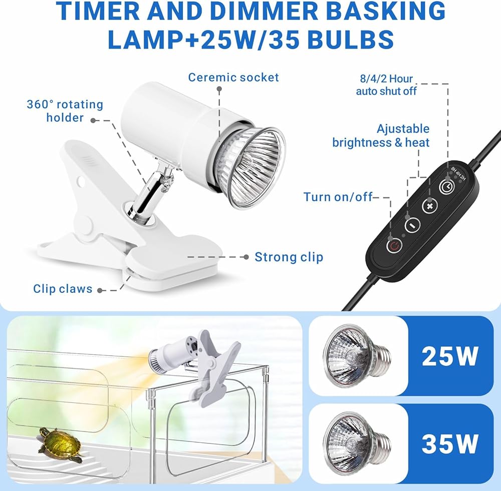 • 【مصباح تشمس UVA/UVB قابل للتعديل + 25W/35W المصابيح】 السلاحف تحتاج إلى 1-2 ساعات من أشعة الشمس يوميًا للتمثيل الغذائي ، تنظيم المزاج ، التكاثر ، إلخ. بالإضافة إلى التحكم في درجة الحرارة ، يمكن أيضًا ضبط مصباح الاستحمام لمدة 2 أو 4 أو 8 ساعات مع وظيفة الإغلاق التلقائي لمدة 24 ساعة في المتوسط. جعل حمام الشمس المريح لأصدقائك الزواحف.