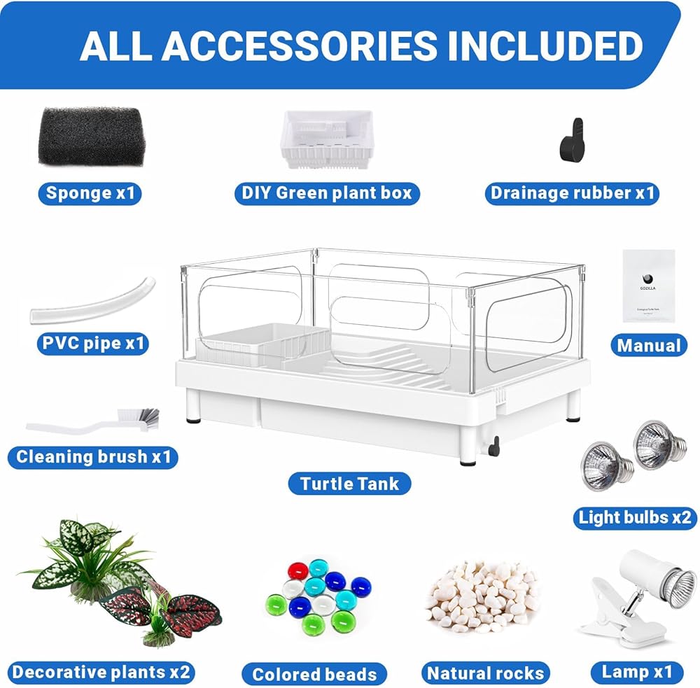 • 【مجموعة أدوات خزان السلاحف والملحقات الكاملة】 مجموعة طقم خزان Gozilla Turtle تتكون من جميع الملحقات التي تحتاجها ، بما في ذلك قاعدة الخزان 1*، المصباح 1*مع 2*مصابيح ، مرشح 1*مع لوحات مرشح 2*، 1*أنبوب PVC ، 1*الصرف الصحي المطاط ، 1*الإسفنج ، 2*النباتات الزخرفية ، 1*فرشاة التنظيف ، 1*كيس من الصخور (240G) ، 1*كيس من الخرز الملون و 1*يدوي. وفر وقتك لشراء كل هذه الملحقات بشكل منفصل.