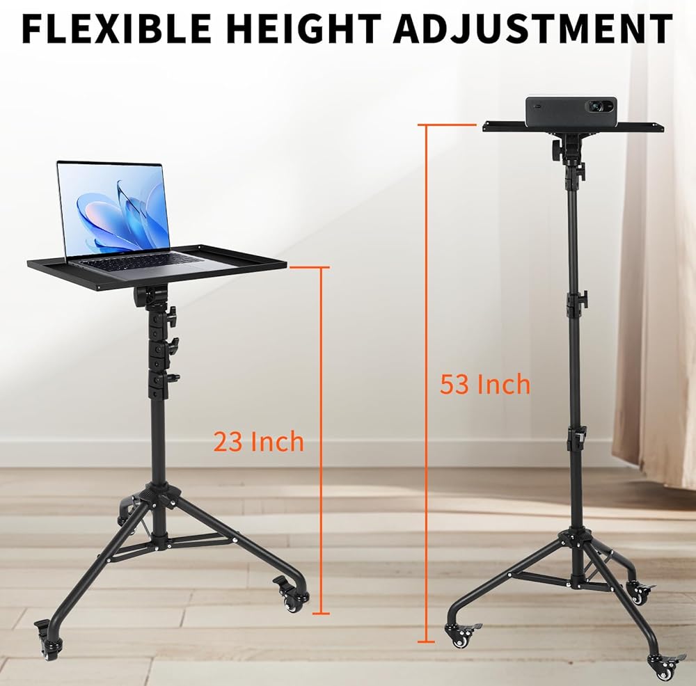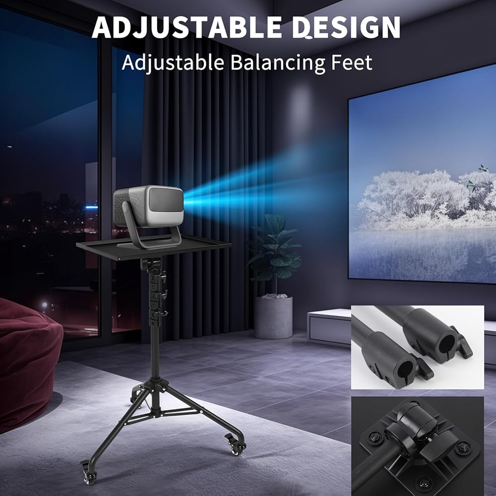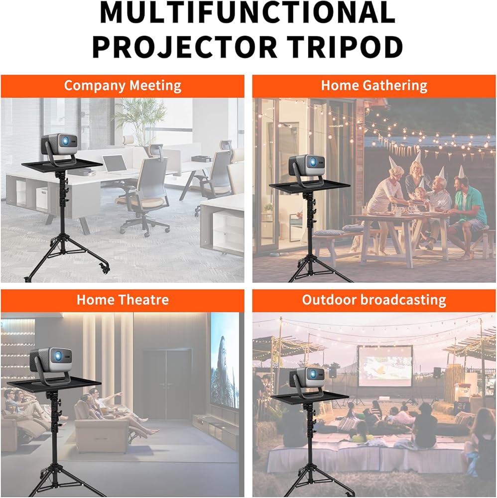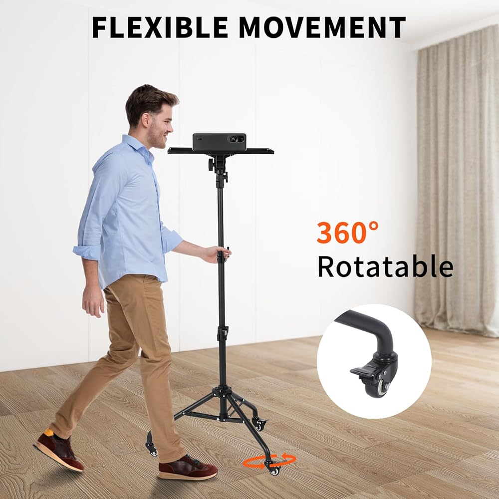[موقف العرض مع عجلات الدوران]: تم تجهيز حامل جهاز العرض مع العجلات بعجلات دوارة صامتة للتداول السلس في أي اتجاه. بعد ضبط الموضع الصحيح ، يمكنك إصلاحه عن طريق إغلاق المزلاج على العجلة العالمية. يعد جهاز العرض ترايبود مساعد جيد بالنسبة لك لاستخدامه في مثل الحفلات المنزلية والاجتماع والترفيه.