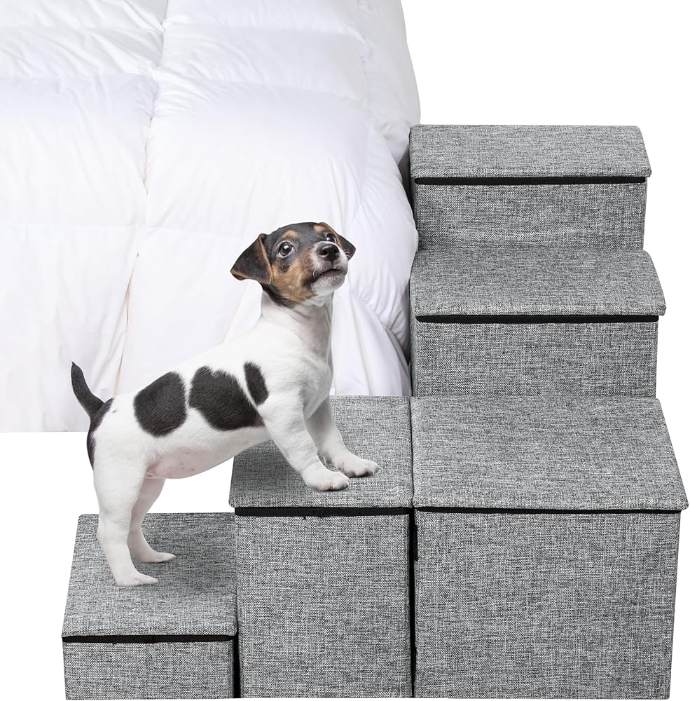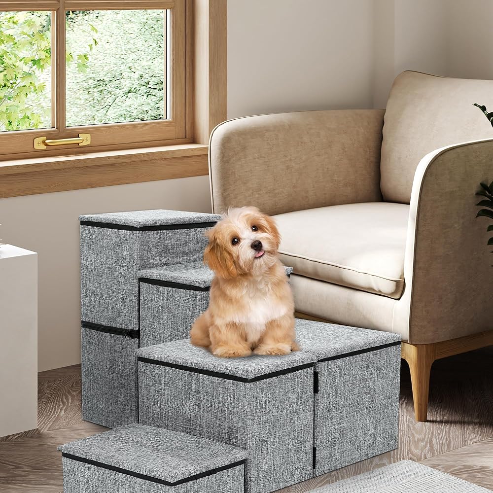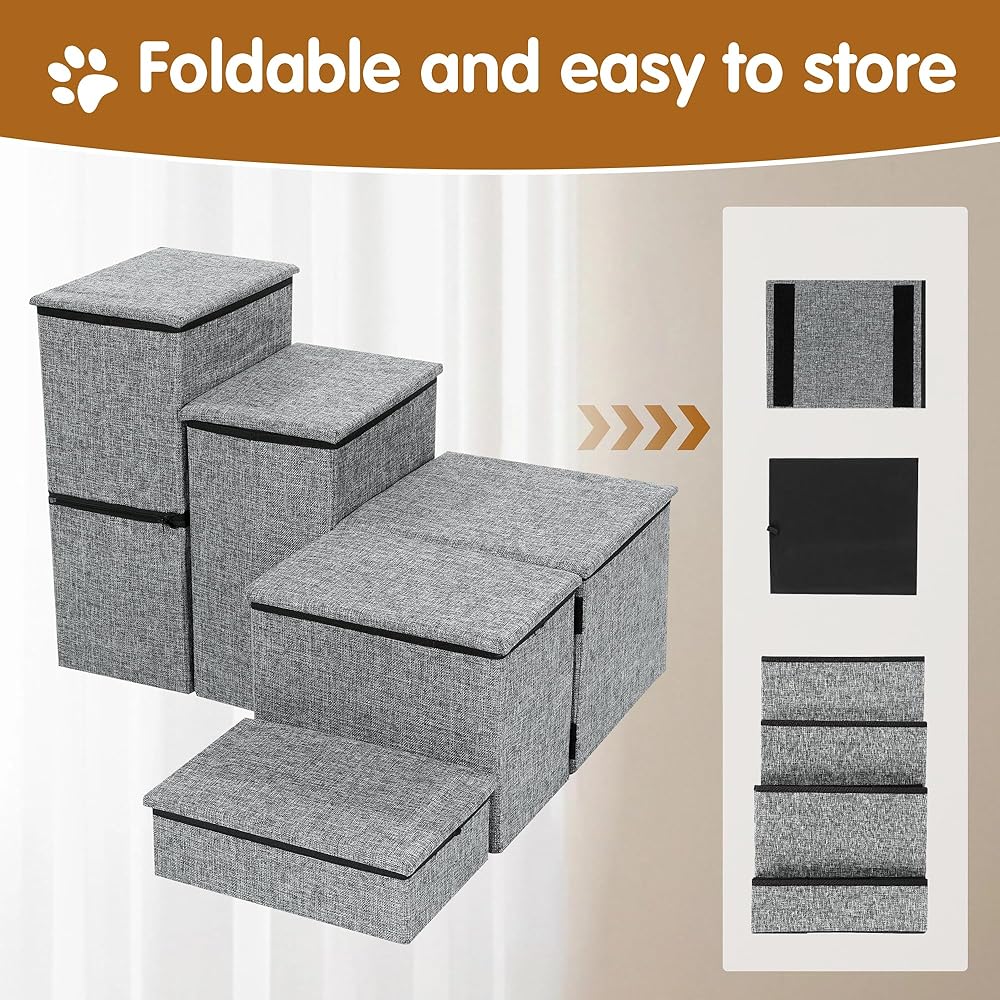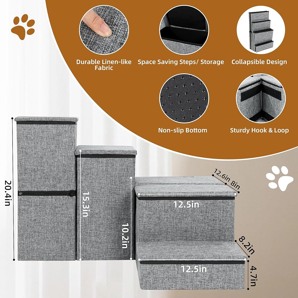 【Convenient Foldable Dog Stairs】: Enjoy quick and hassle-free installation.The installation process is very simple and can be completed in a few minutes without the need for tools.The foldable design makes it convenient to store when not in use. Additionally, with extra storage space for each box for toys and snacks.