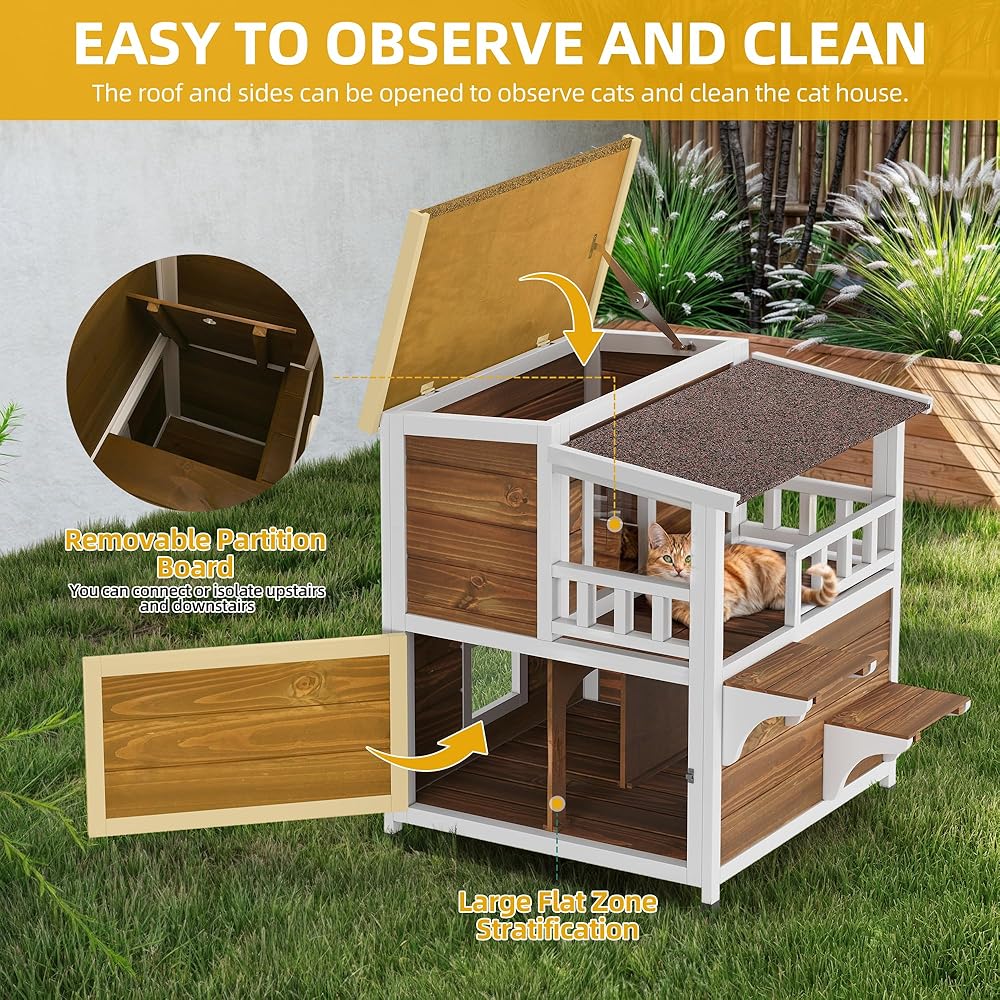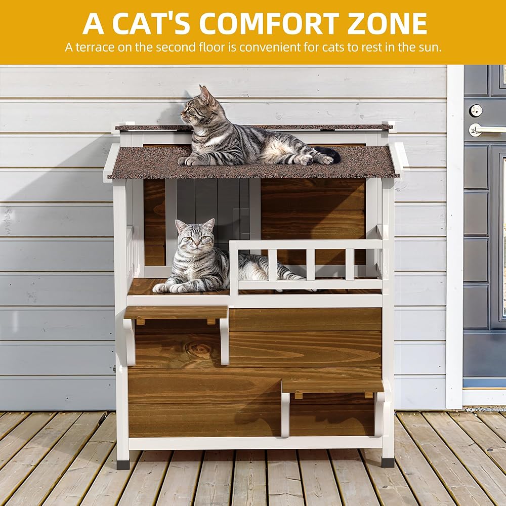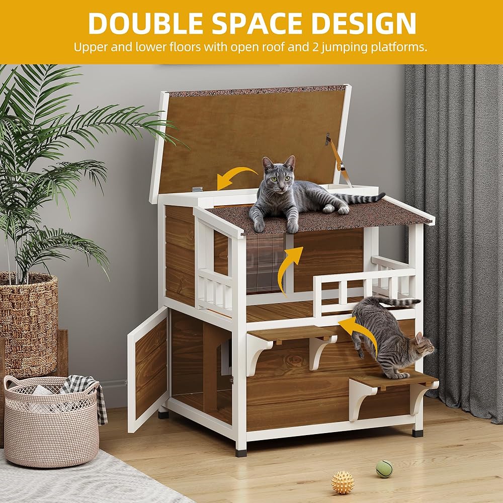 • ملاذ واسع لأصدقاء القطط: يوفر منزل القط الخارجي المكون من طابقين تصميمًا داخليًا موسعًا بأبعاد تبلغ 28.3 "D x 34.5" W × 33.3 "H ، مما يصل بشكل مريح إلى قطتين.