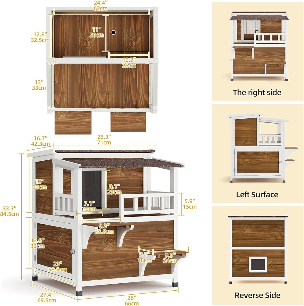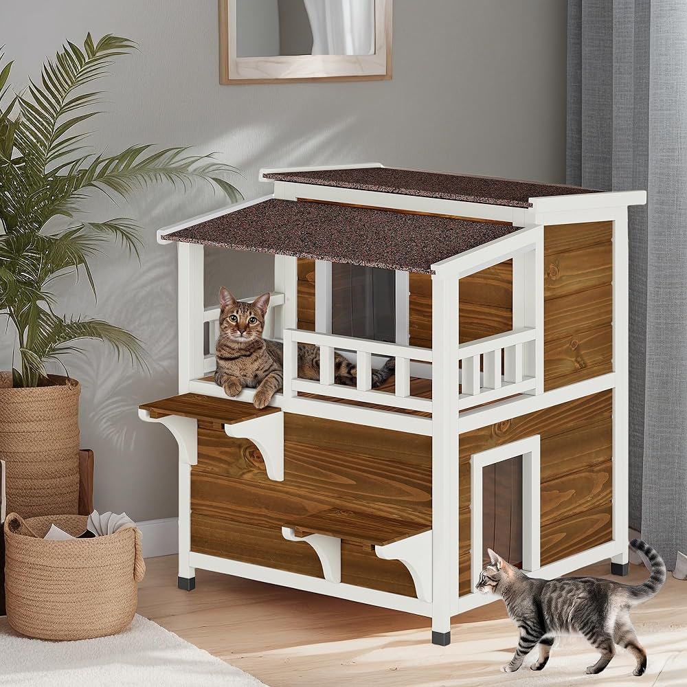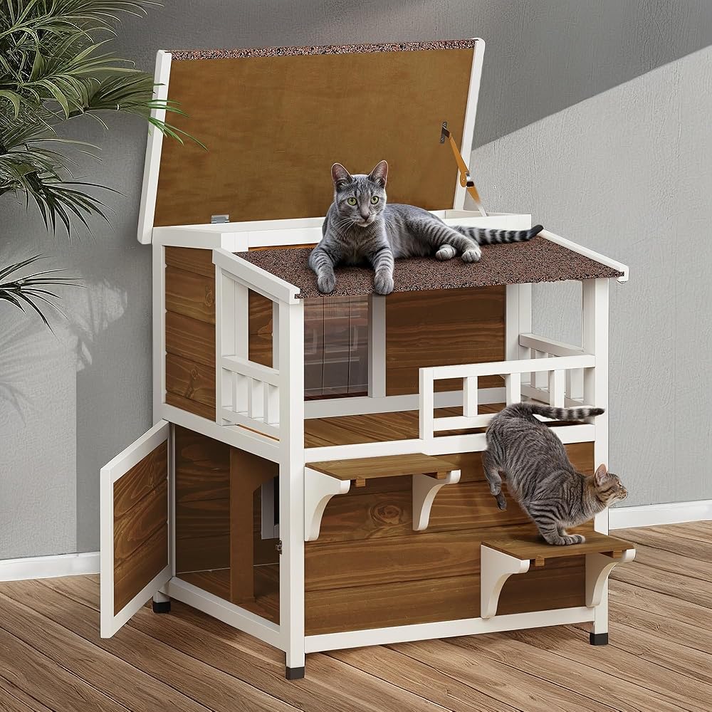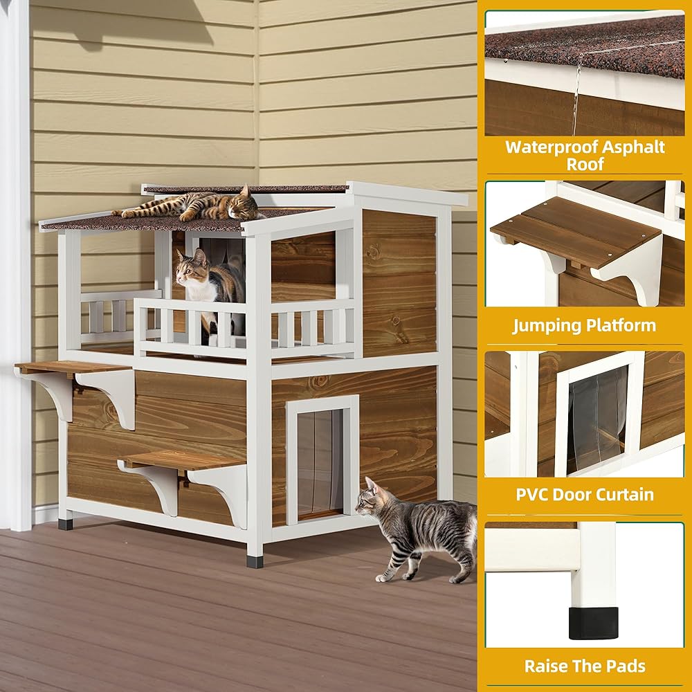 • ملاذ واسع لأصدقاء القطط: يوفر منزل القط الخارجي المكون من طابقين تصميمًا داخليًا موسعًا بأبعاد تبلغ 28.3 "D x 34.5" W × 33.3 "H ، مما يصل بشكل مريح إلى قطتين.