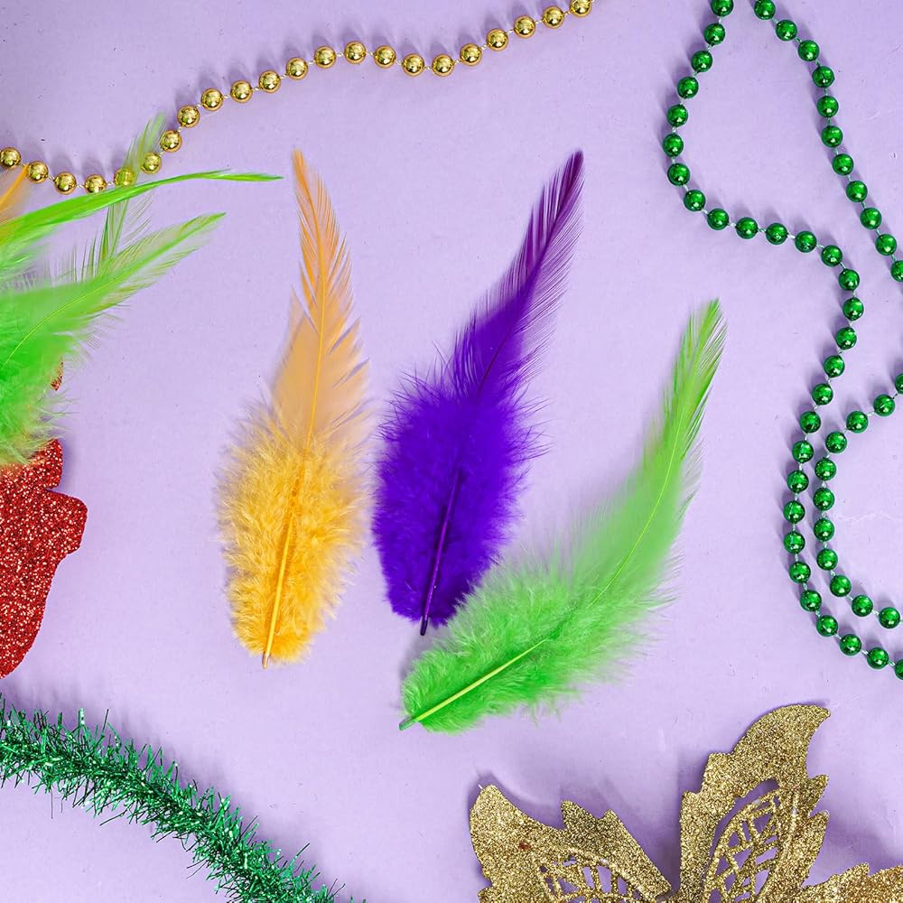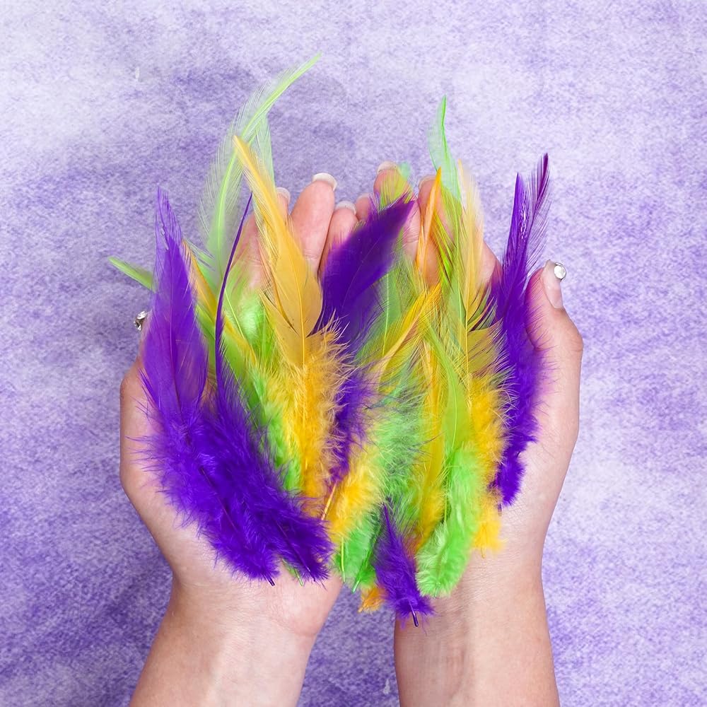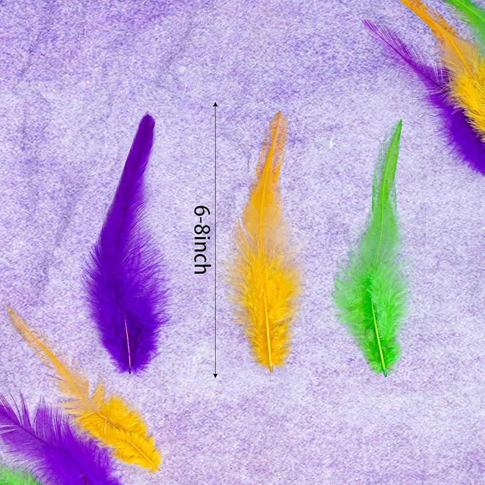 • What you will get: You will receive 300 Mardi Gras craft feathers, available in three colors: yellow, purple, and green, with 100 rooster feathers for crafts of each color. The quantity is sufficient for various DIY activities, such as decorating carnival parties