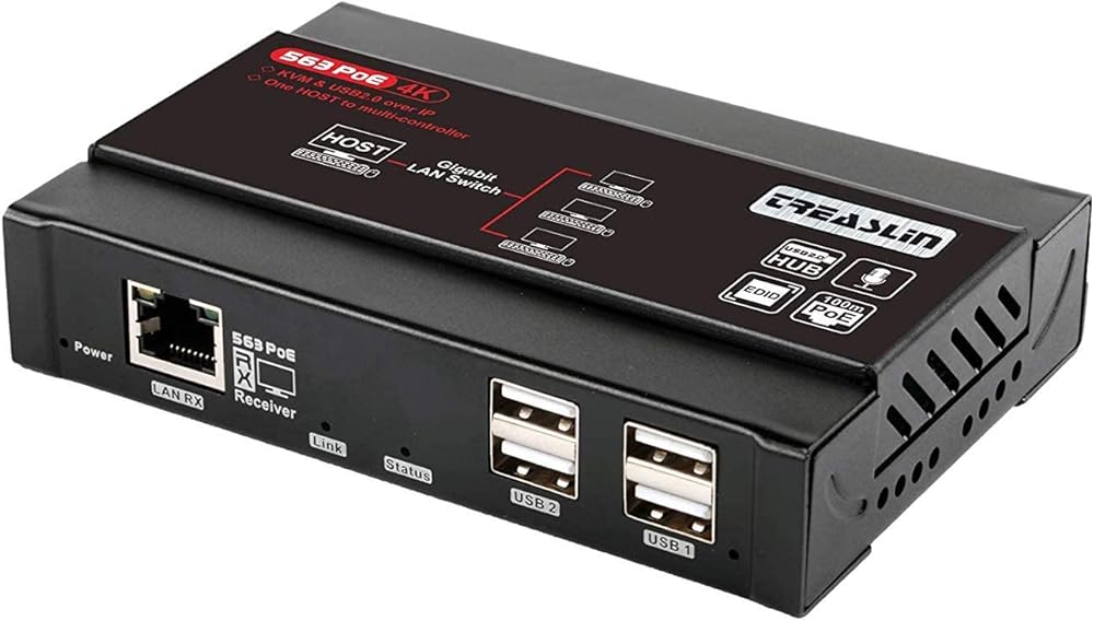 موسع TreasLin HDMI USB KVM (جهاز الاستقبال فقط) 4K@30 هرتز، KVM عبر IP يدعم محول شبكة Gigabit POE عبر Cat5e/6 حتى 383 قدمًا، منفذ USB 2.0 4 مع موسع إدارة EDID مستقل