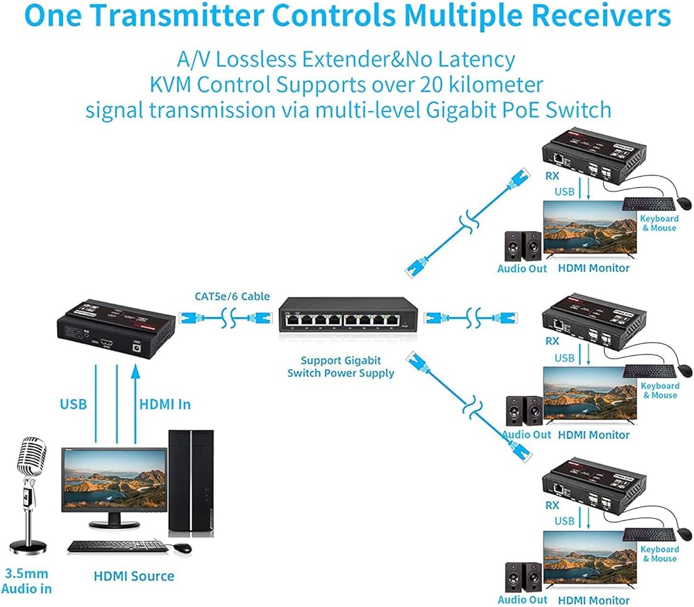 【موسع KVM واحد إلى العديد 】يدعم امتداد KVM وUSB من نقطة إلى نقطة/1TX إلى 253RX عبر مفتاح جيجابت PoE، ويمكنه أيضًا دعم التحكم متعدد العبيد في شبكة المضيف. يمكن لهذا المنتج تمديد مسافة نقل إشارة KVM وUSB إلى 20 كيلومترًا من خلال امتداد الشبكة المتتالية للمفاتيح متعددة المستويات.