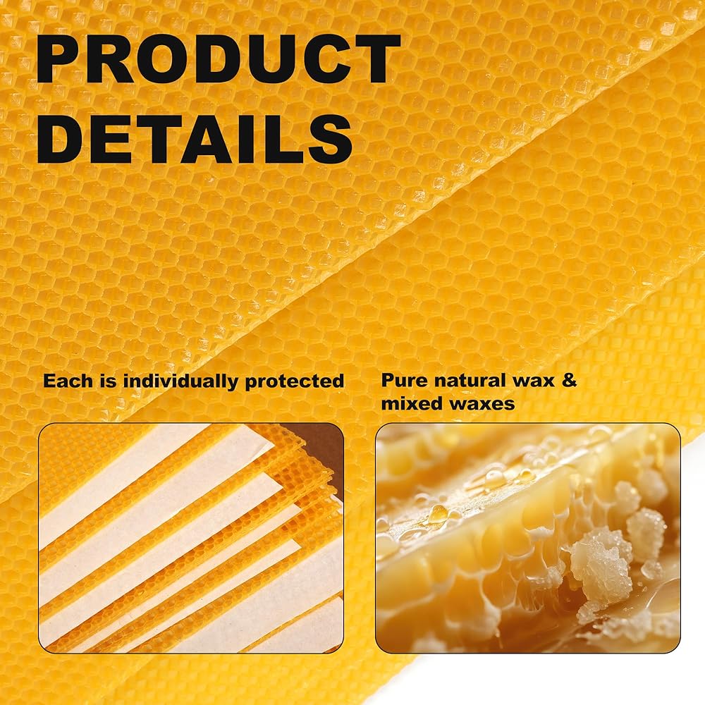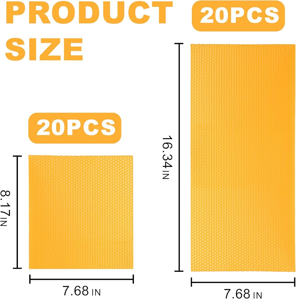 Common Sizes For Beehives:The package contains 40 pieces of beeswax sheets, 20pcsX 41.5*19.5cm+ 20pcs X 20.75*19.5;each sheet is equipped with an individual protective film, which is perfect for beehives and is a must-have item for beekeepers