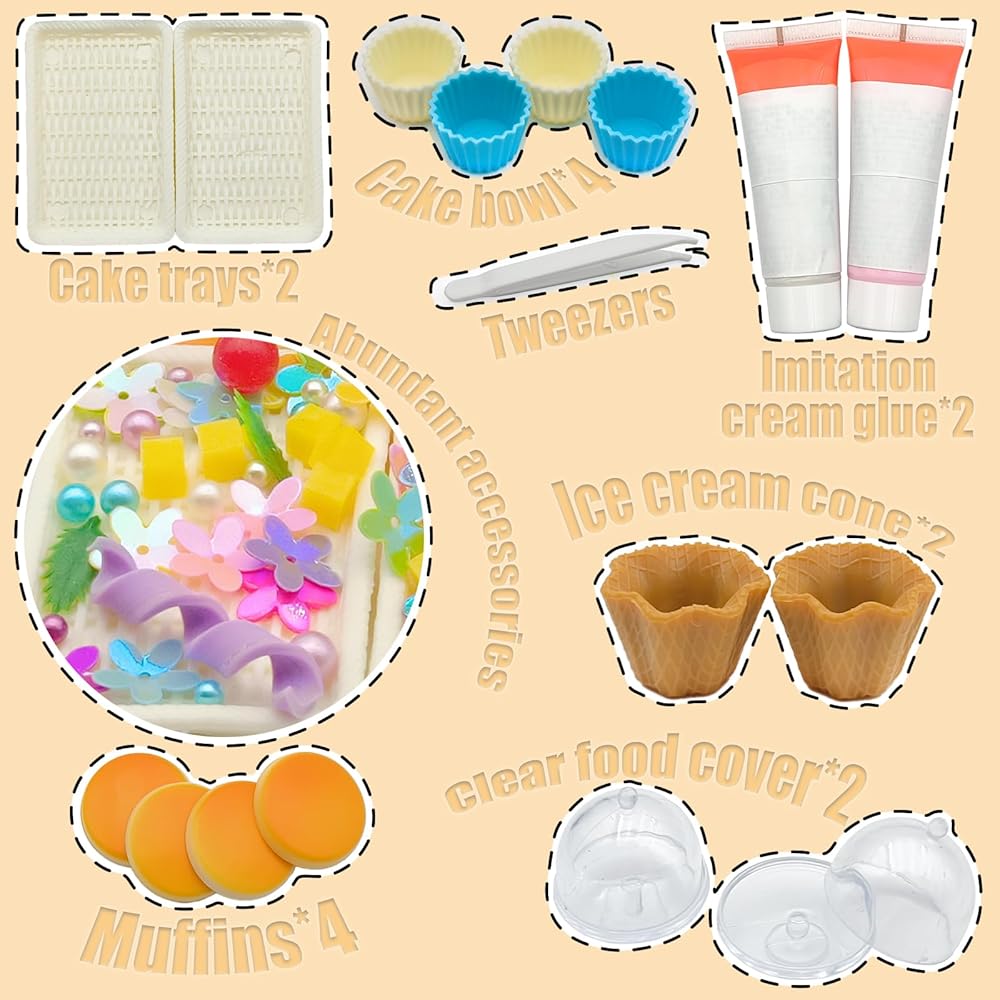 إكسسوارات مختلفة: تحتوي لعبة الطعام المصغرة على 6 أكواب من الآيس كريم الصغيرة ، 6 قضبان الشوكولاتة ، 4 مصاصات ملونة صغيرة ، 3 حلوى بلاستيكية ، 12 قطعة ، لآلئ ملونة وأزهار وغيرها من الملحقات الزخرفية