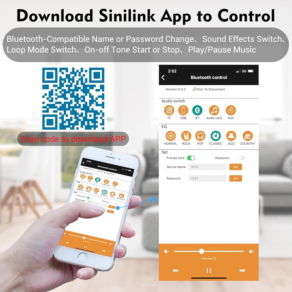 • 【التحكم في التطبيق】قم بتنزيل تطبيق Sinilink والوصول إلى الوضع السياحي دون التسجيل. وهو يدعم تبديل المؤثرات الصوتية ووضع الحلقة وبدء/إيقاف نغمة الطاقة. يتيح لك تطبيق Sinilink تعديل الاسم وكلمة المرور المتوافقين مع تقنية Bluetooth، وتخصيص هوية جهازك وتعزيز الأمان.