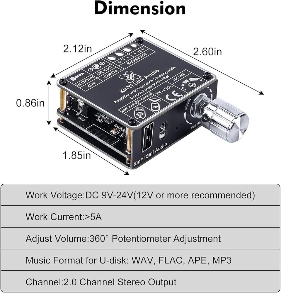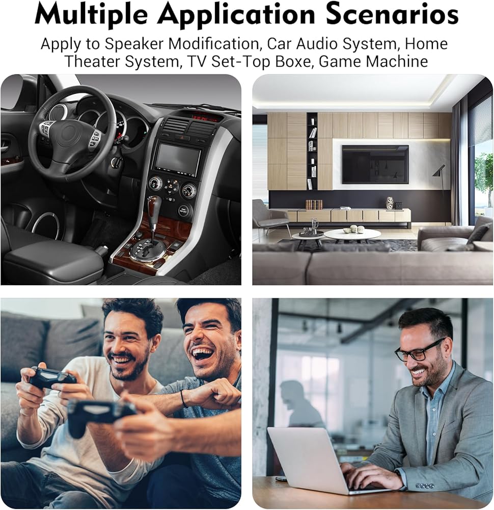 • 【متوافق مع البلوتوث + AUX+USB】توفر لوحة مضخم الصوت هذه ثلاثة خيارات إدخال: متوافقة مع البلوتوث، وAUX، وUSB. متوافق مع تنسيقات الصوت المختلفة بما في ذلك WAV، WMA، FLAC، APE، وMP3. فهو يتصل بسلاسة مع أجهزة مثل الهواتف الذكية وأجهزة الكمبيوتر ووحدات التحكم الصوتية، ويجمع بين وظائف متعددة لتعزيز الراحة.