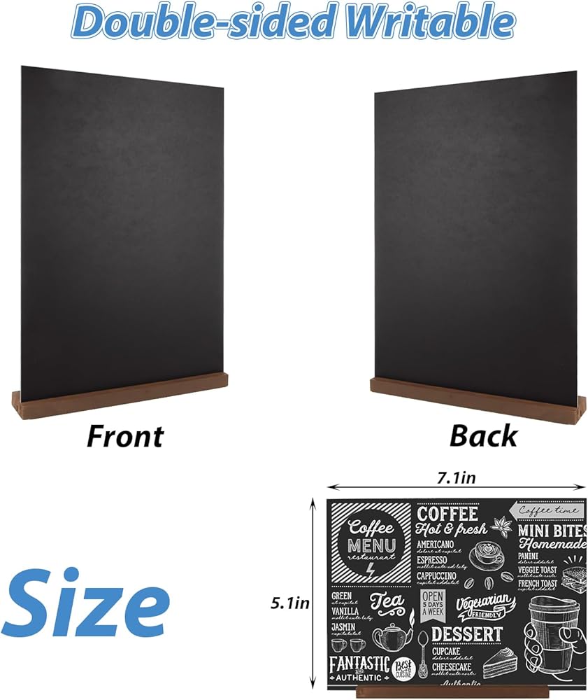 Size: Decorative chalk board sign board are approximately 5 x 7 inches, which is a good size with enough space for you to write important information and display it in a prominent way. Double side to write, great for small business, advertise your product and the prices with cute mini chalkboard signs
