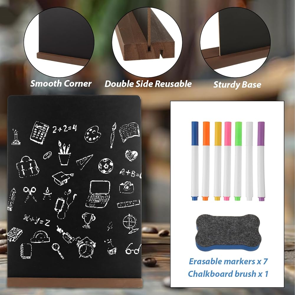 Chalkboard Sign Set: Package includes chalkboard signs x 6, chalkboard brush x 1, colorful erasable markers x7, chalk board writable on both sides. Mini chalkboard signs with stand can be used food signs, displaying messages, wedding decorations, table numbers, guest names signs and so on, suitable for different decorative styles