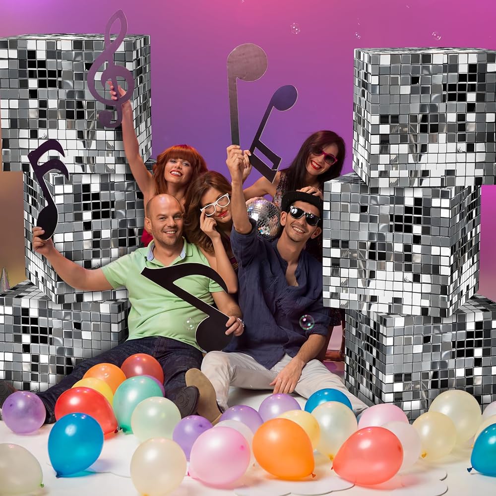 Reliable Quality and Design: crafted from cardboard that's both reliable and visually appealing, our disco party box decor is a versatile addition to any celebration, each box approximately measures 11.81 x 11.81 x 11.81 inches offering enough room for candies, snacks, balloons, and other party essentials, experience a lively disco with these festive accessories