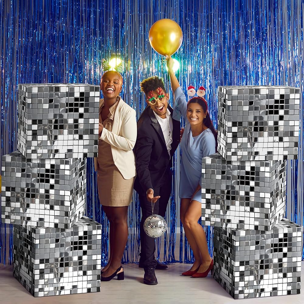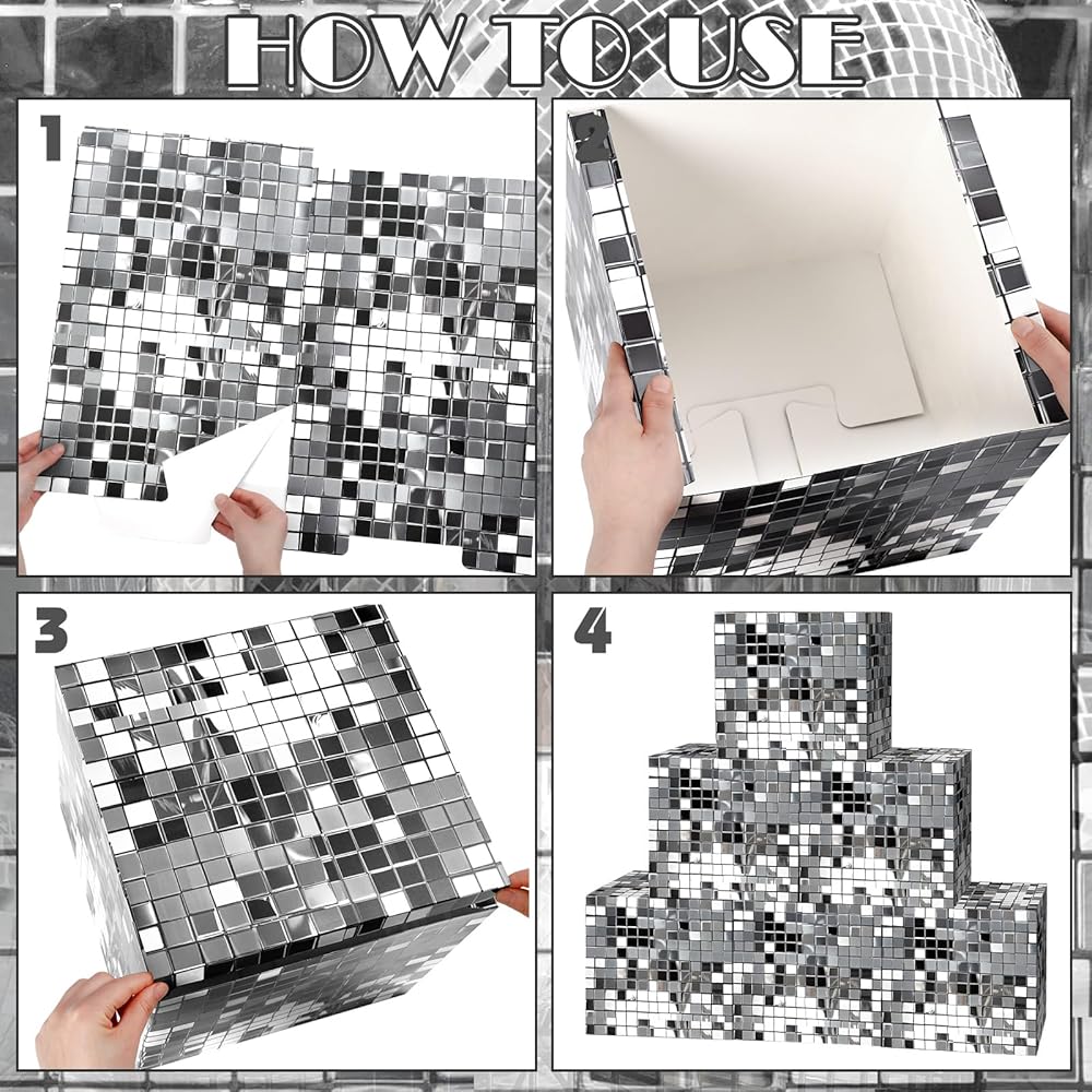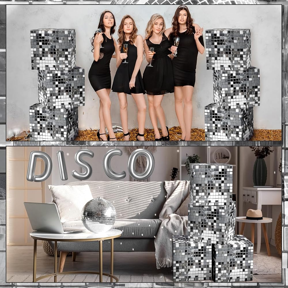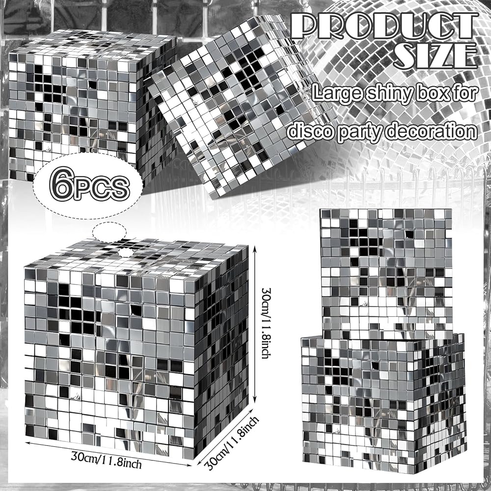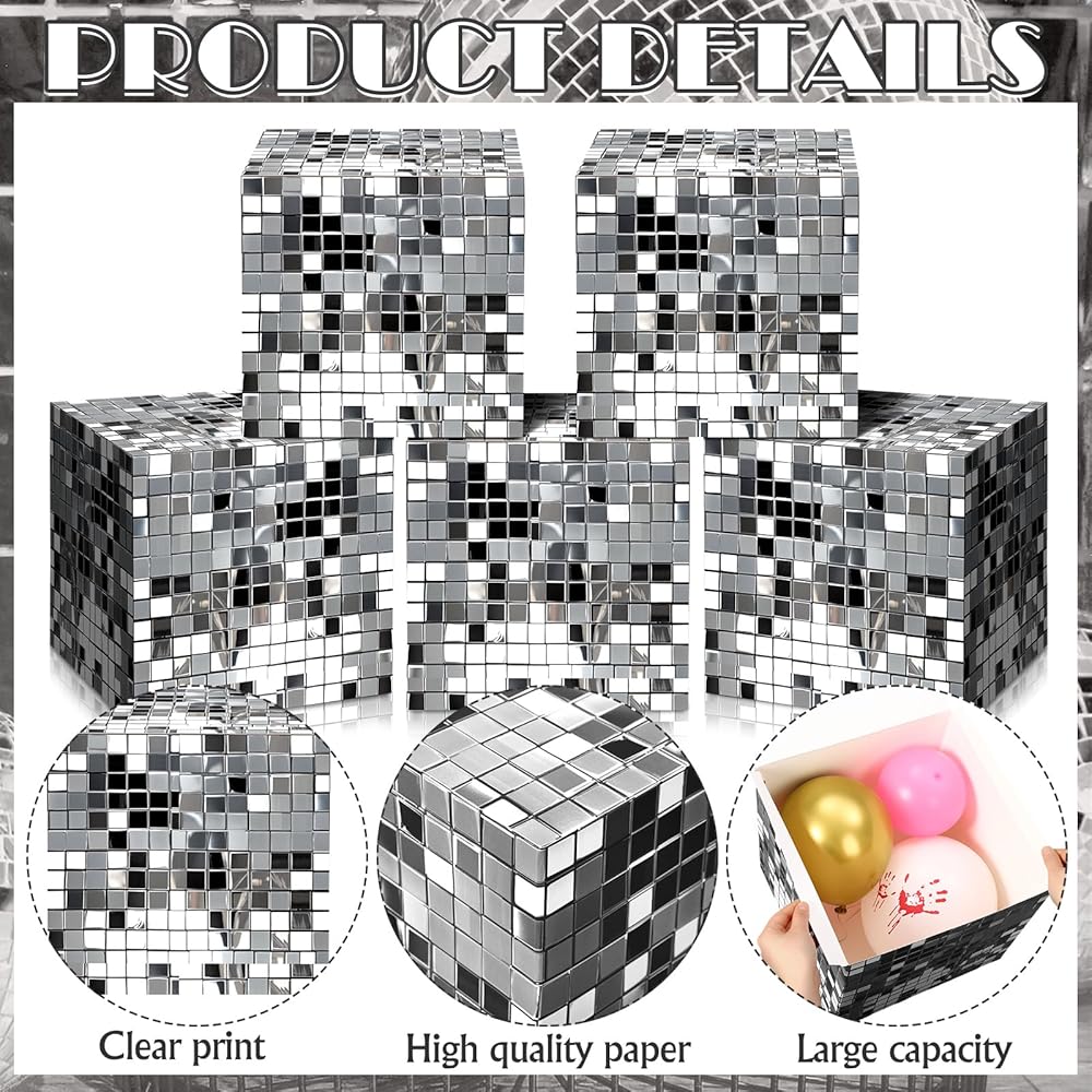 Disco Ball Themed Design: our party decoration boxes come adorned with an original disco mirror ball pattern design, the ornamentation with its silver gloss and shine certainly adds a nostalgic feel to your party, positioned anywhere, these decorative boxes promise to catch eyes and enhance the overall ambiance, creating a disco party that's unforgettable